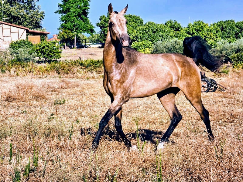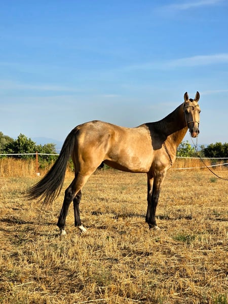 Purebred Akhal Teke registered in the Russian studbook, sired by the renowned Kambarbay. Raised in complete freedom, he possesses a very balanced temperament and is very trusting, allowing you to do as you wish. He is good with the farrier, familiar with the saddle, bit, and rider; mounts and dismounts perfectly. He is fully confident and learns very quickly. In excellent health, he will make a fantastic riding horse.