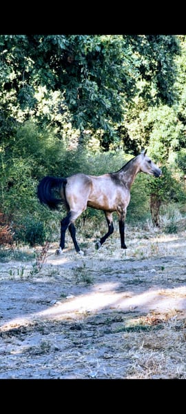 Akhal Teke Purebred registered in the Russian studbook, son of the famous Kambarbay, raised in total freedom, has a very balanced mind, lets you do whatever you want, is good with the farrier, he knows the Saddle, bit, and rider; gets on and off the vehicle perfectly; he is completely confident and learns very quickly; he is perfectly healthy; he will be a great horse