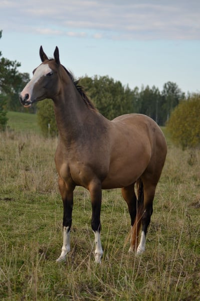 Proven broodmare and riding horse FAZA EST (Chirchiq A x Firiuda, El sire line, Gezel dam line) 2017 buckskin mare, 156cm Offered with international concierge support for transport and delivery on behalf of Akhal-Teke EST . Raised and located in Estonia, ready for export anywhere. This powerful mare is really special and any program would be lucky to have her. Faza is has been an excellent broodmare with good type, great big movements, and lovely disposition. She has lots of groundwork (loose and on rope) and has been lightly ridden even out on forest trails. She is easy to ride with naturally very forward gaits. She is the dam of our two fabulous fillies (buckskin Farida EST by Mudjahid and Kiza EST by Kizil Yulduz, imported to us in the USA) and is currently in foal to Kizil Yulduz again, due in mid-June 2026. Faza comes from a great lineage of champion racing and classical sport horses. On her elite sire’s side, Faza is granddaughter of elite dressage and jumping horses Daimir (2005 European Reserve Champion Stallion) and Chilga (2006 European Champion Mare, 2009 Virtual Champion Mare) from Turkmen racing stallion Karaburgut. Faza’s Stavropol dam was linebred on Gelishikli (through great racehorses Garem and Dagestan) and became grandmother to two 2014 Young European Champions (stallion Sergesdan and mare Fuksiya). From Faza’s dam side, Faza is also granddaughter of Fonema who was dam to Stavropol stallion Feisal, 2000 Young Champion of Russia. Photos from Akhal-Teke EST. Contact us for more information!