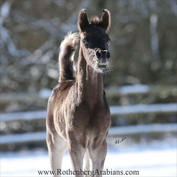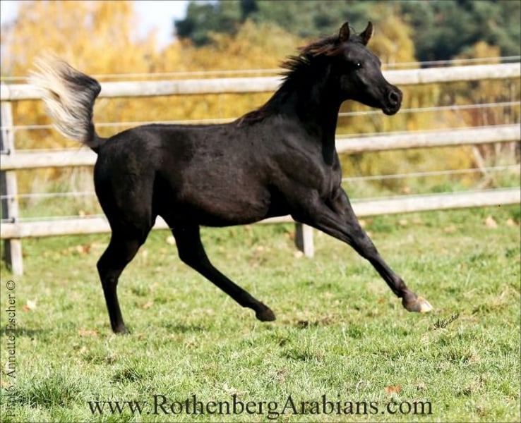 Super exotic typey black Straight Egyptian colt in gorgeous all overall quality for breeding & show! By our black Gold-premium stallion GR Ishad (by black Gold-premium stallion GR Nashad exp. Kuwait x Shaylah Bint Iman by Multi-Champion Classic Shadwan) out of a daughter of black Gold-premium stallion Maheeb! Motherline goes back to our foundation-mare Samara Bint Moheba out of the famous Salha line from EAO! Outstandig proven Straight Egyptian pedigree, exotic typey face, perfect in body, topline and legs and additional fantastic super showy movements - just and outstanding black colt! Father and both grandfathers are black Gold premium stallions of the German Registry, nearly impossible to find! Additional sale-horses on request! For more information please have a look at our homepage www.RothenbergArabians.com or send an e-mail! Please also visit us at Instagram: #RothenbergArabianStud