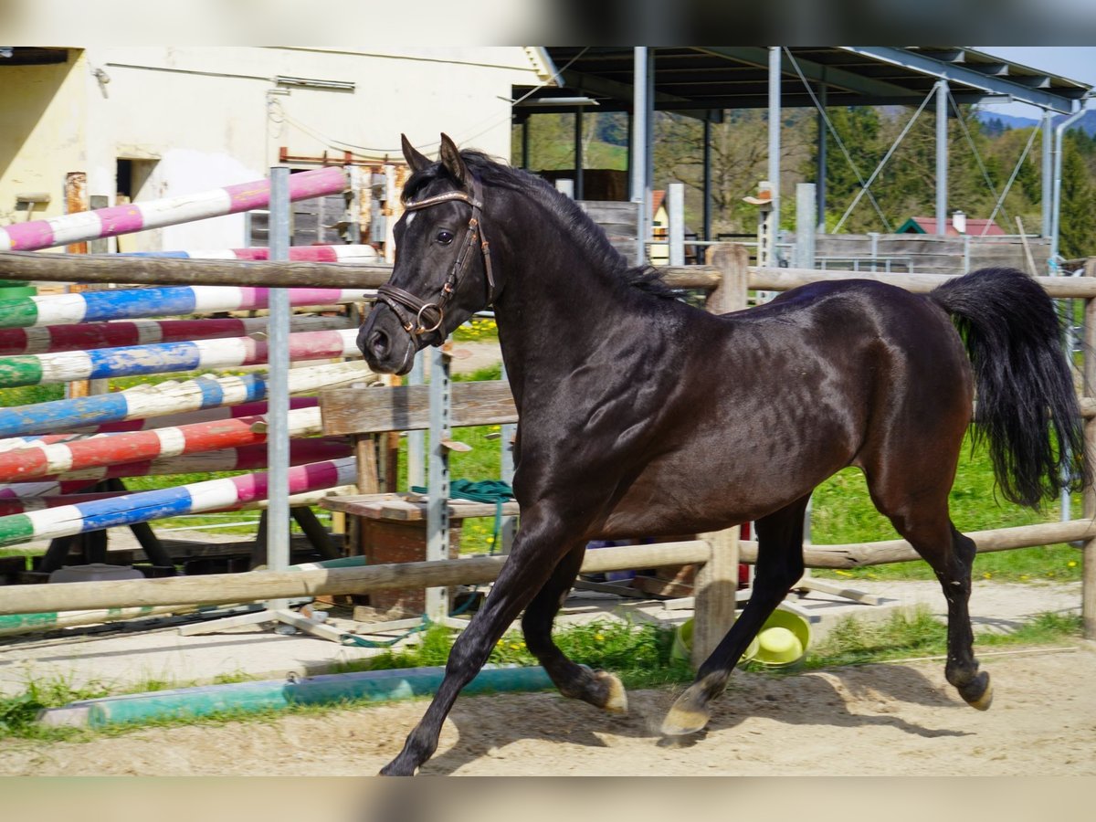 5-year-old Egyptian black stallion without markings for sale. He has been raised in a species-appropriate manner with us and spent the last summer on alpine pastures with other stallions. He is currently in training. In terms of character, he is very reserved towards strangers, but once he has built trust, he allows everything to be done with him. He is currently in training, which is somewhat challenging at the moment due to his hormones. He will only be sold to knowledgeable individuals of this specific breed. Due to his lineage and correct conformation, he could also be considered for breeding; otherwise, keeping him as a gelding would be better for him and his future owner. Since we have several half-sisters of his, a trade for an unrelated black stallion could also be considered.