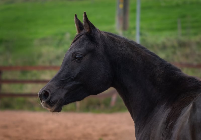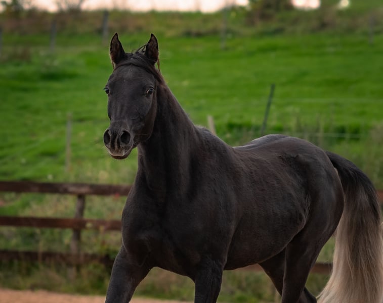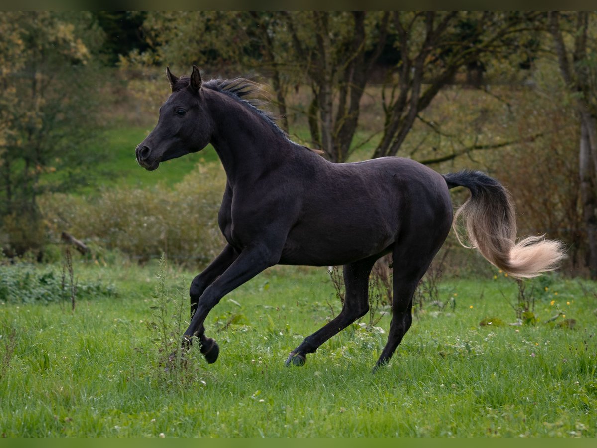 Aisha is a stunning, well-built, purebred black Egyptian Arabian mare with a sweet, human-oriented character and an intriguing pedigree that makes her highly interesting for breeding. She has correct conformation, solid foundations, a harmonious body, and a good topline. Her refined, typy, dry face features large, expressive dark eyes and a delicate muzzle. Her head flows smoothly into a refined neck and a well-shaped, elegant neck. Her strong body, with well-angulated shoulders and hips, and a good topline, stands on correct legs with very good hooves. A special color highlight is her silver tail hair, a genetic trait inherited through the maternal line (not Rabicano). Her movements are expansive, elastic, and lively, with three well-defined basic gaits. She is very calm and nerve-strong. Aisha has a gentle character, enjoys cuddling, and seeks to please. She is intelligent, quick to learn, and eager to pick up new things. Her interesting pedigree and homozygosity for the black gene make her especially appealing for Arabian breeding. She is free from the genetic defects CA, SCID, and LFS. All these qualities make Rania very promising as a future broodmare. She also shows great potential as a riding horse for endurance and demanding leisure riding. She will be a loyal companion you can rely on through thick and thin. Both her parents are good riding horses. Aisha is familiar with ground work, hoof care, trailer loading, children, cattle, cats, dogs, large machinery, traffic, etc.—in short, everything a young horse should know. She was raised in a herd and is very well socialized. Upon request, Aisha can be bred to one of my purebred Egyptian Arabian stallions, guaranteeing a black purebred Egyptian foal.