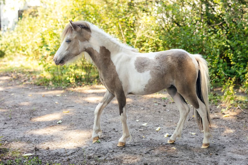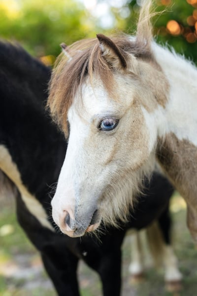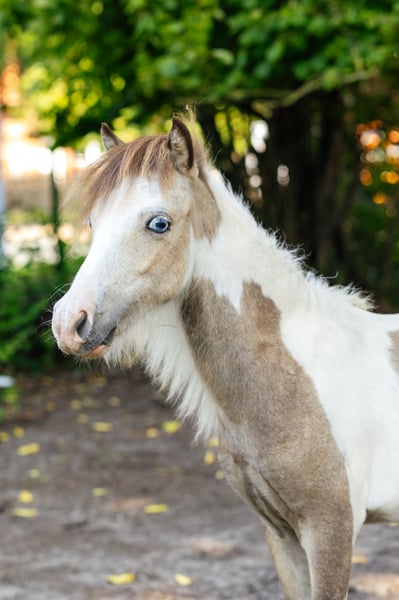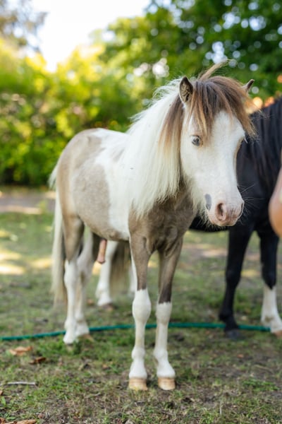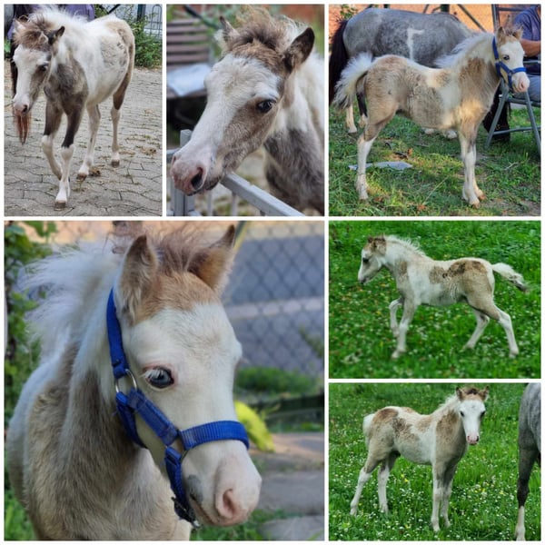 We are selling our VMS Vegas Obi-Wan Kenobi, born June 2024. He has the stunning Buckskin Tovero coat color (Tobiano and Overo LWO+) with two bright blue eyes. He features very expressive, ground-covering gaits and is an elegant young stallion. He is registered with AMHA and is ACAN negative. Obi-Wan has been exposed to all the basics appropriate for his age. Currently, he stands at 82 cm (32.3 inches). If you're looking for a true eye-catcher, this handsome American Miniature Horse stallion is not to be missed. More photos and videos available upon request. Installment plans are also possible, depending on the arrangement.