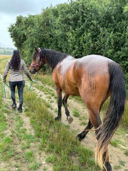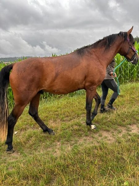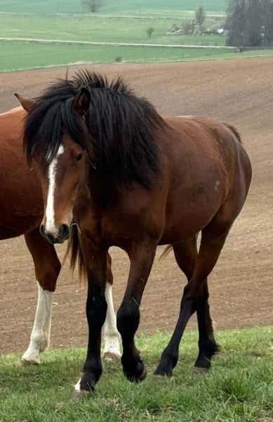 In vendita il nostro puledro stallone Morganhorse 2023, Barney, proveniente dalla nostra MtnTop Alegria di BarNon Pleasure. Ha documenti originali americani ed è registrato presso l'AMHA come LHD Mister Boombastic. Inoltre, ha un passaporto equino ed è risultato negativo al test PSSM1. Barney cresce insieme ad altri due puledri stalloni in ampi pascoli collinari, in un allevamento all'aperto tutto l'anno nella regione di Erfurt. Il posto di allevamento può essere utilizzato anche dopo l'acquisto, previo accordo con il proprietario del maneggio. A due anni, Barney attualmente misura 150 cm. Ci aspettiamo un'altezza finale di circa 156 cm. Barney può essere facilmente prelevato dal suo gruppo di giovani stalloni e riportato indietro. Dal maniscalco si mostra assolutamente tranquillo. Ha anche ottenuto senza problemi il completo stato vaccinale. È abituato ai viaggi in trailer fin da piccolo. Barney ha tre andature molto buone e ben cadenzate e si distingue per la sua assoluta calma nel maneggiarlo. Reagisce con interesse ma in modo rilassato a cose/situazioni conosciute o nuove. Con la sua mobilità, il suo carattere e la sua genetica, offre condizioni ideali per il salto ostacoli o per l'uso alla guida. Sua sorellastra materna ci regala soddisfazioni nel dressage, nel salto e come cavallo da carrozza e da tempo libero. Il potenziale riproduttivo di Barney è già stato dimostrato vincendo la classe dei puledri nel 2023 al Day of the Morgan Horse in Assia. Anche alla sua prima esperienza in un ambiente estraneo, con molto pubblico, si è mostrato assolutamente calmo e facilmente gestibile. Entro quest'autunno dovremo decidere se Barney potrà rimanere stallone o meno. Per non ostacolare i vostri piani di allevamento, contattateci pure via email o telefonicamente al +49 170 1292274. Siamo felici di ricevere le vostre domande e considerazioni.