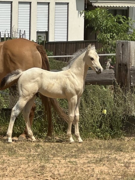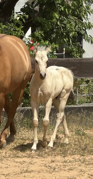 The General Nixon – stunningly beautiful Paint Horse colt (born May 2023, approximate height 14.1 hh) with striking Buckskin coloration. He impresses with his correct, compact, and muscular build as well as good conformation. Healthy, strong, and well-founded – a real eye-catcher! The foal is raised appropriately in a herd with peers and demonstrates excellent social compatibility. He is handled daily, familiar with the vet and farrier at the time of sale, regularly dewormed, and vaccinated according to age. Nixxon’s character is outstanding: very affectionate and people-oriented, cuddly, well-behaved, uncomplicated, and laid-back. He loves his cuddles and is a great mover – ideal for leisure riding and competitions. His pedigree makes reining enthusiasts’ hearts beat faster – grandson of HR Mobster / Gunnersaurus Rex. He has excellent potential for sport while remaining a pleasure to handle at all times. A true gem for those seeking a talented, loving young horse with lots of potential!