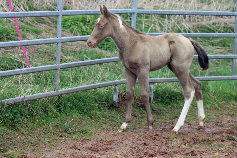 CHEYENNES VUDU CASH Classic Champagne Tobiano APHA stallion. Homozygous Champagne and Black Born: May 14, 2025 Expected height approx. 153 cm 7 Panel N/N EE aa CHCH Tt