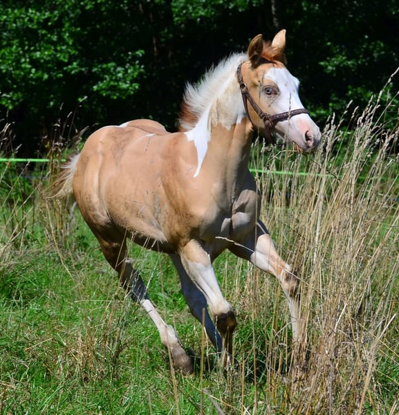 Jackson is homozygous for the Tobiano gene. He will always produce colorful foals. He has a bright blue eye. A brilliant pattern and great body! He is of course 7 Panel N/N. He is raised in a species-appropriate manner on large pastures in a big herd. He has papers from the APHA and a passport from the PHCG.