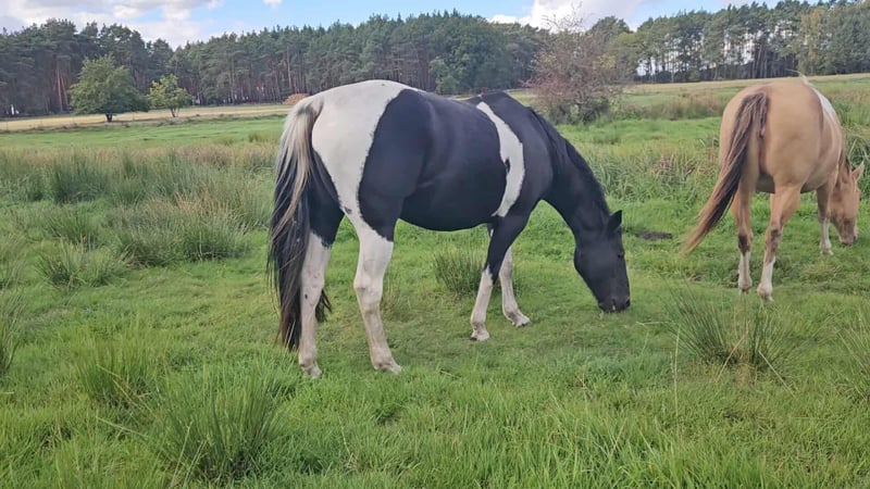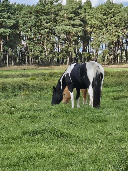 Straits Poco Sue - eine bildhübsche Paint Horse Stute, geboren 2016, mit einem Stockmaß von ca. 154 cm. Sie besticht durch ihre außergewöhnlich schöne black tobiano-Färbung, ist homozygot tobiano und besitzt ein korrektes, kompaktes Fundament. Charakterlich ist sie ein echter Schatz - ruhig, liebevoll und sehr menschenbezogen. Im Umgang zeigt sie sich stets freundlich und bemüht, alles richtig zu machen. Sie wirkt fast wie ein Kinderpony, da sie so gelassen ist und auch im Schritt und Trab problemlos von Kindern geritten werden kann. Sue wurde von einer Jugendlichen geritten und hat eine solide Westernausbildung. Sie ist geländesicher und zeigt sich unter dem Sattel aufmerksam und lernwillig. Im Galopp kann sie vor Freude hin und wieder einen kleinen Buckler zeigen, weshalb sie einen Reiter braucht, der konsequent, aber feinfühlig mit ihr umgeht. Wird sie korrekt gearbeitet, zeigt sie sich auch in der Gangart brav und kooperativ. Leider ist sie zurzeit nicht ausgelastet. Sie ist gesund, regelmäßig entwurmt, brav beim Tierarzt und Hufschmied und kennt sowohl Offenstall - als auch Boxenhaltung. Ihre Zuchtqualitäten sind ebenfalls hervorzuheben: Sie stammt aus einer guten Paint Horse Linie, war bereits Mutter und hat problemlos aufgenommen sowie ohne Komplikationen gefohlt. Ihre Nachzucht war stets korrekt und vielversprechend. Da leider die Zeit fehlt, ihr gerecht zu werden, wird für diese tolle, liebe Stute ein neues, wertschätzendes Zuhause gesucht - sei es in der Zucht, im Freizeitbereich oder beidem. Straits Poco Sue bringt alles mit, was man sich von einer zuverlässigen, freundlichen Partnerin wünscht.