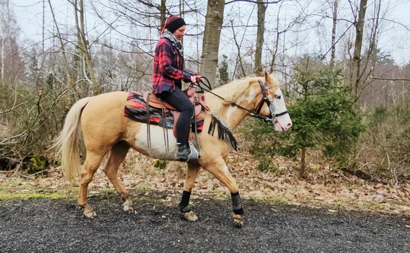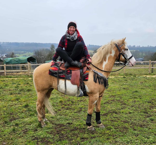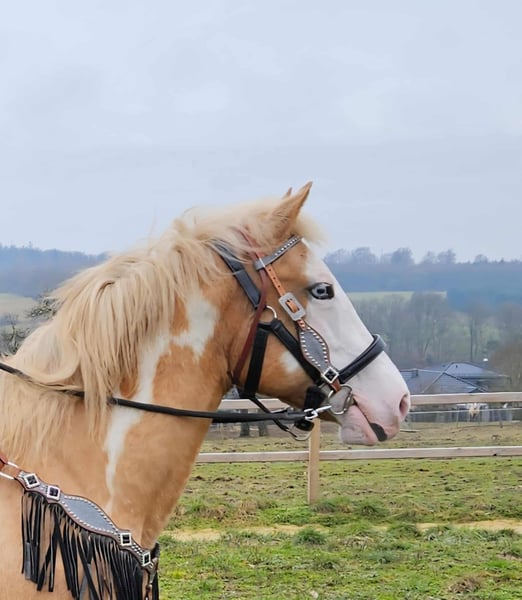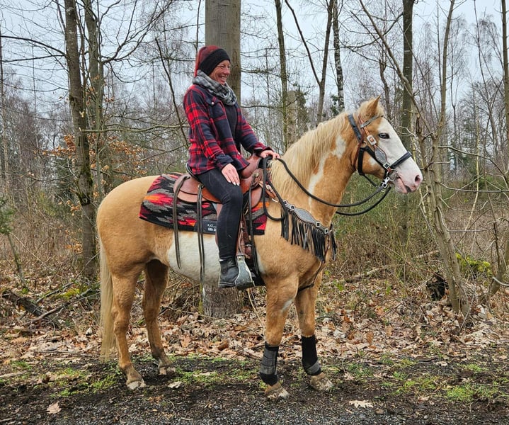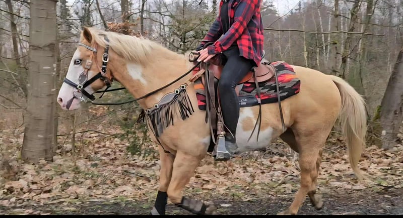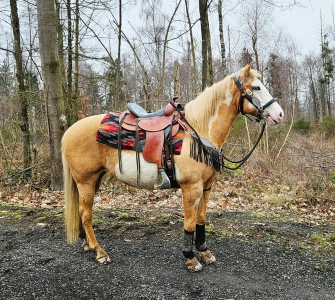 Beautifully marked Palomino Overo mare – well-behaved, rideable, and reliable Age: turning 11 in June Height: approximately 1.57 m (16.1 hh) Price: €7,800 AKU: available ✨ Description: This stunning Palomino Overo mare captivates not only with her distinctive markings but also with her balanced and friendly nature. In daily handling, she proves to be exceptionally well-behaved, calm, and uncomplicated. Grooming, leading, and general stable routines are completely trouble-free for her. Under saddle, she is very rideable and pleasant to ride – both in the arena and in the terrain. She works reliably, is sensitive to aids, and provides her rider with a secure, relaxed feeling. Thanks to her gentle nature, she is an excellent, dependable partner for leisure riding. Ideal for: Riders seeking a well-behaved, honest, and rideable mare for recreational riding, trail riding, and arena work. Also suitable for relaxed leisure riders who value a reliable horse. Our horses are regularly: – dewormed – attended to by the blacksmith – osteopathically checked Farm shop: Western saddles, bridles & accessories Transport and equipment can be organized affordably upon request Our services: ✅ 3-month exchange guarantee ✅ Test ride: €35, each additional horse €25 (credited on the day of purchase) ✅ €100 immediate discount for pickup or transport on the same day ✅ Personal & honest advice Please inquire exclusively by phone: 0171 – 4001968 Available daily from 8 a.m. to 8 p.m. ⚠️ No emails or WhatsApp messages ⚠️ All information without guarantee