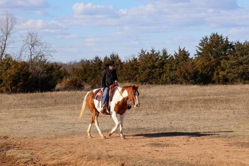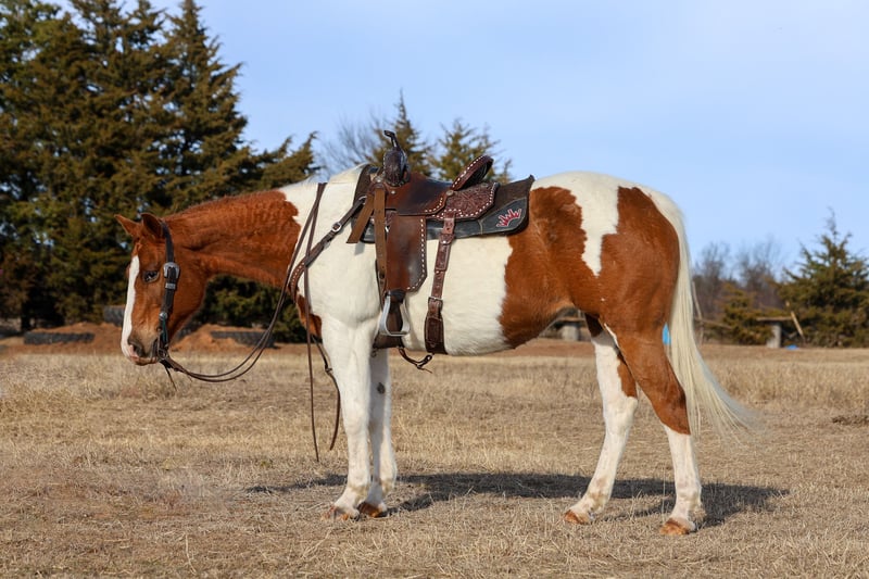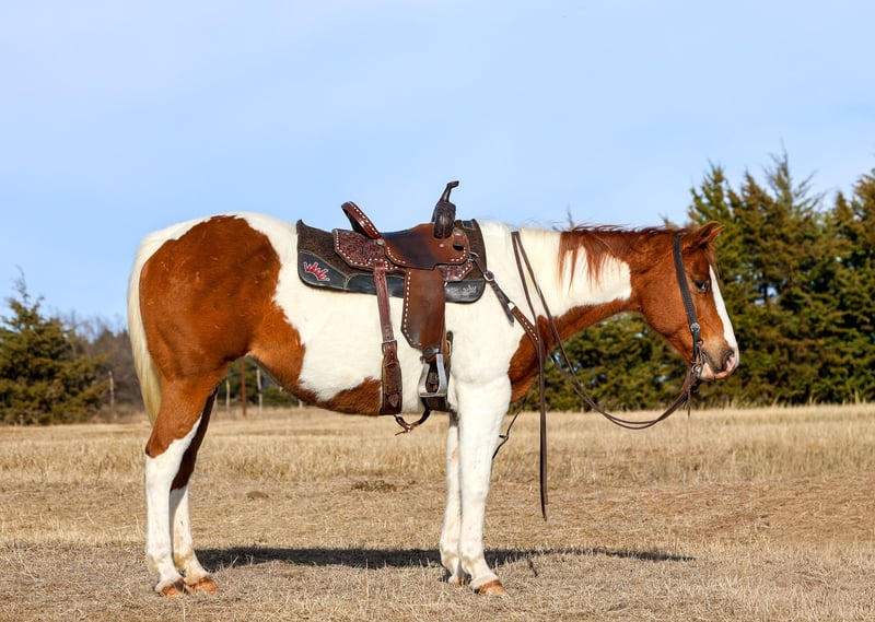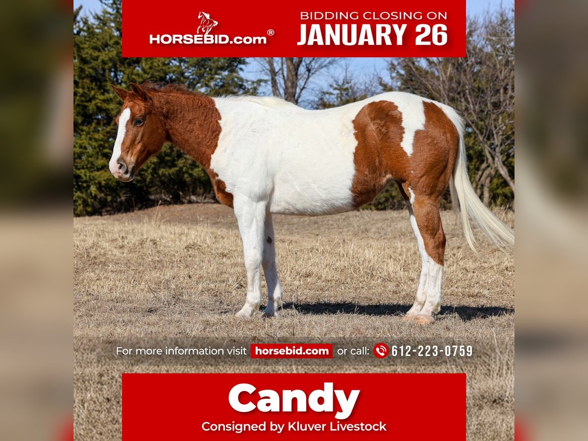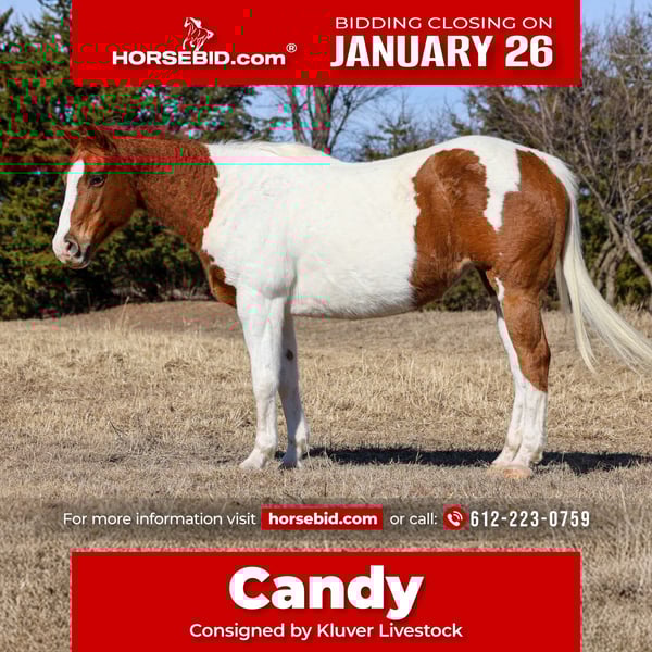 𝐉𝐀𝐍𝐔𝐀𝐑𝐘 ⭐️𝑨𝒍𝒍 𝑺𝒕𝒂𝒓 𝑳𝒊𝒏𝒆𝒖𝒑⭐️ Happening now thru MONDAY | JANUARY 26th - Available EXCLUSIVELY on HorseBid's website! For more details and to register visit: www.Horsebid.com CONSIGNOR CONTACT: Kluver Livestock 612-223-0759 LOCATION: Ripley, OK BREED: Paint REGISTERED: No REGISTERED NAME: Candy COLOR: Paint HEIGHT: 14.3 AGE: 12 GENDER: Mare Candy is a 12 year old mare that is as gentle as she is pretty, Truly gentle, gentle, gentle. She is kid, grandma, therapy, anyone broke and has been ridden hundreds of miles on trails all over the country. She stays broke with time off and has absolutely no buck or funny business. Candy will ride off alone with no hesitation and is confident whether she’s by herself or in a group. This mare never bats an eye at absolutely anything, the definition of a bomb proof horse. She is easy to catch and has outstanding ground manners. She also as sweet as candy! Candy has been used extensively as a leadline and pony mare for kids, as well as in beginner riding lessons, and she takes excellent care of her riders. If you’re looking for a kind, safe, confidence building horse, Candy is about as good as it gets.