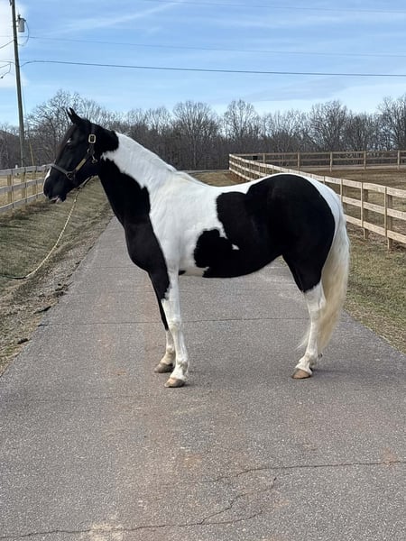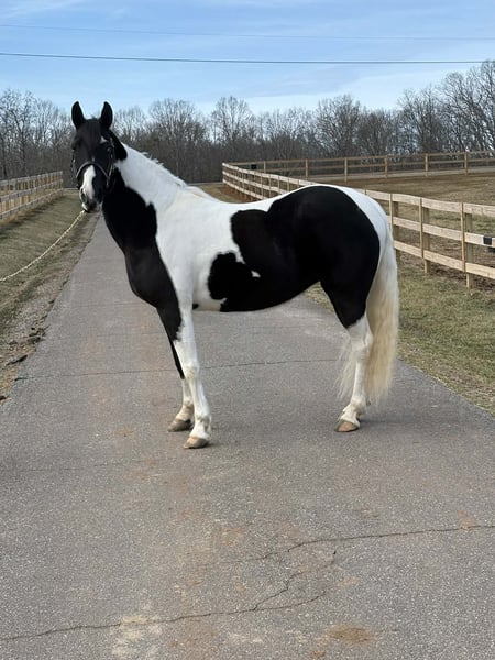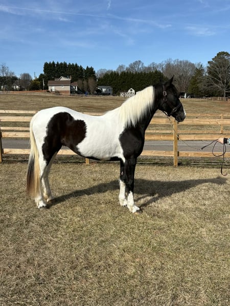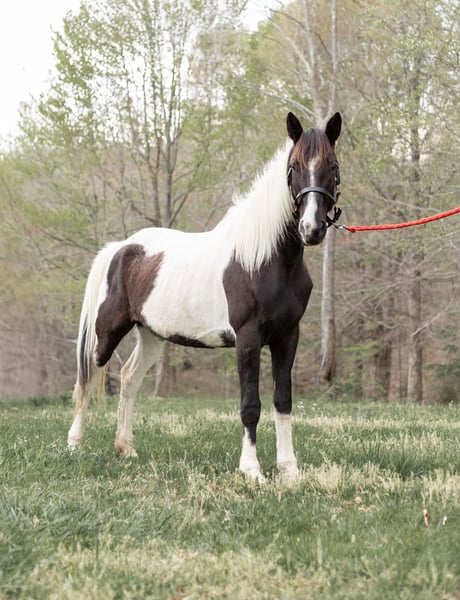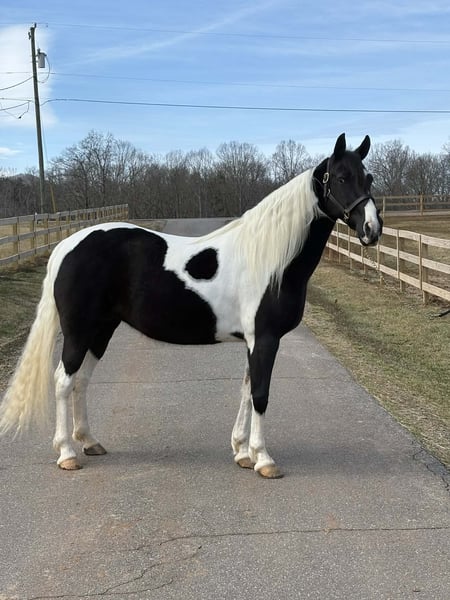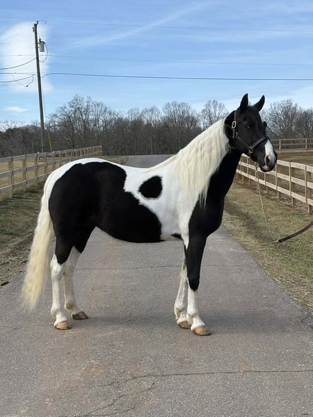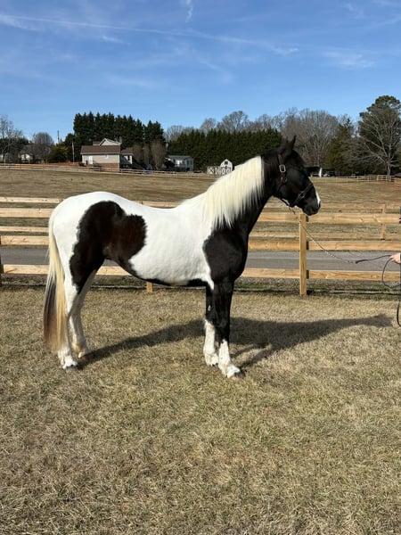 "AVAILABLE ON ONLINE HORSE AUCTION AT www DOT PlatinumEquineAuction DOT com BIDDING OPEN NOW thru SUNDAY | APRIL 5TH! *Final price will be determined on auction site* CONSIGNOR CONTACT INFO: Laura Barnes 828-302-9054 LOCATION: Granite Falls, NC If you are searching for a dependable, confidence-building trail partner with eye-catching appeal, this mare checks every box. She stands approximately 15.2 hands and is 12, almost 13 years old, offering the rare combination of beauty, brains, and a truly gentle disposition. She is not marish, extremely level-headed, and has safely carried beginners, children, and inexperienced riders with ease. She is the type of horse you can let sit for weeks, then saddle up and ride off with the same calm, willing attitude. On the trail, she confidently crosses creeks, ditches, and rough terrain without hesitation. She is traffic-safe and accustomed to real-world riding, and she is sure-footed and steady even in new environments. Her natural, smooth gait makes her comfortable for long rides and enjoyable for riders of all experience levels. Her manners on the ground are impeccable. She stands quietly for mounting, tying, and grooming, and she is excellent for the farrier. She is easy to catch, meets you in the pasture, and loads and hauls without issue. She has never bucked, reared, bolted, bitten, or kicked. For more information contact Laura Barnes 828-302-9054.