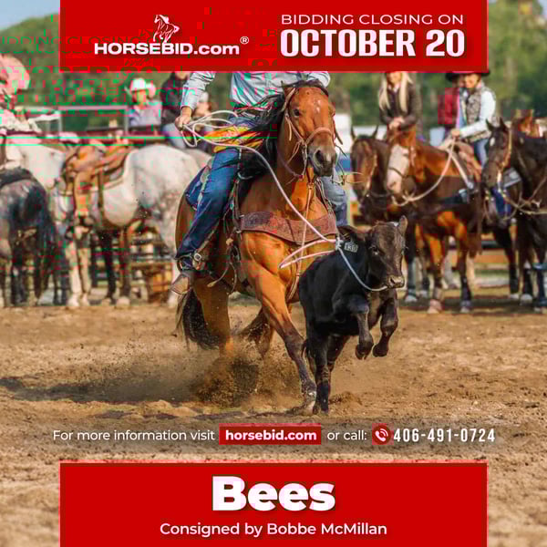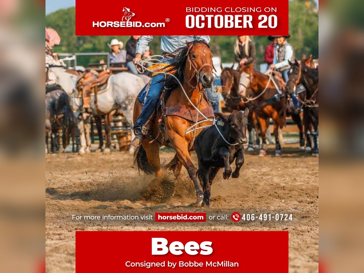 ♦️ 𝐭𝐡𝐞 𝐀𝐌𝐄𝐑𝐈𝐂𝐀𝐍 𝓕𝓪𝓵𝓵 𝓒𝓵𝓪𝓼𝓼𝓲𝓬 ♦️ Happening now thru MONDAY | OCTOBER 20th - Available EXCLUSIVELY on HorseBid's website! For more details and to register visit: www.Horsebid.com CONSIGNOR CONTACT: Bobbe McMillan 406-491-0724 LOCATION: Huntley MT BREED: APHA REGISTERED: Yes REGISTERED NAME: EASY BEES HISOX COLOR: Bay HEIGHT: 15.1 AGE: 13 GENDER: Mare 🏆 2012 APHA Mare – 15.1h | 1200 lbs | PRO RODEO BREAKAWAY MONEY EARNER & ALL-AROUND CHAMPION – RANCH AND RODEO HORSE DELUXE 🏆 Meet Bees – the unicorn that proves you can have it all: speed, brains, and ability. She’s a true pro rodeo level breakaway horse that has won money at PRCA rodeos, open rodeos, and jackpots. If you’re serious about winning, you’ll want her in your trailer — not your competition’s. 🔥 Career Highlights: • Pro Rodeo Breakaway Money Earner – Sitting Bull Stampede, Big Horn Circuit & more • 2nd Round Winner & 7th Overall – Black Eagle Breakaway • 3rd at Sitting Bull Stampede PRCA Pro Rodeo • Year-End Champion Breakaway Horse of the Big Horn Circuit Finals • All-Around WWYR Horse of the Year – 1st in Heading & Breakaway • Countless open rodeo and jackpot wins (we stopped counting when the checks started stacking) 🎯 Breakaway Machine: Bees is quiet in the box, leaves flat, and gives you the same, consistent shot every single time. She’s been jump-ridden by multiple people, including beginners, at rodeos and always performs — because she’s a pro through and through. She will not get outran, she will not get rattled, and she’s always on your team. 🐴 Versatile & Proven Ranch Horse: Not just a breakaway horse — Bees is a jackpot-winning money earning heading, heeling, and barrel horse too. Fancy broke, all the buttons, all the feel. She’ll spin, stop, and slide like she’s read the rulebook. A ranch horse deluxe that’s as useful as she is pretty. If you need one that’s as gritty as she is gentle, and as broke as she is brave, Bees checks every box. Whether you’re competing at a pro rodeo, picking up, branding calves, or chasing one across the pasture, she’s always ready to clock in and go to work. She’ll pick up broncs, drag bulls to the gate, and never loses her composure doing it. Doesn’t matter if it’s dust flying, ropes swinging, or the crowd roaring — she stays solid, and gets the job done smooth as silk like the true pro she is. 💪 Sound, Solid, Simple: • 0 maintenance • Great legs & feet, no blemishes • Easy to catch, saddle, bridle, shoe, trailer, bathe • Sits for months and comes back the same • Gentle enough for a confident youth, talented enough for a pro 💬 Personality Check: Not hot — just super broke and a forward mover with all the buttons. A timid beginner might get lost in her buttons, but a confident rider will feel like they’re driving a Ferrari with auto-steer. 🌟 In Short: Bees is that rare horse who can go win a PRCA rodeo on Saturday and carry a youth rider to a buckle on Sunday. She’s as solid as they come, proven in every way, and easy to love. 📍 Located Huntley MT 📞 PM to come try her — but don’t wait too long. Horses like Bees don’t just win checks; they disappear fast.