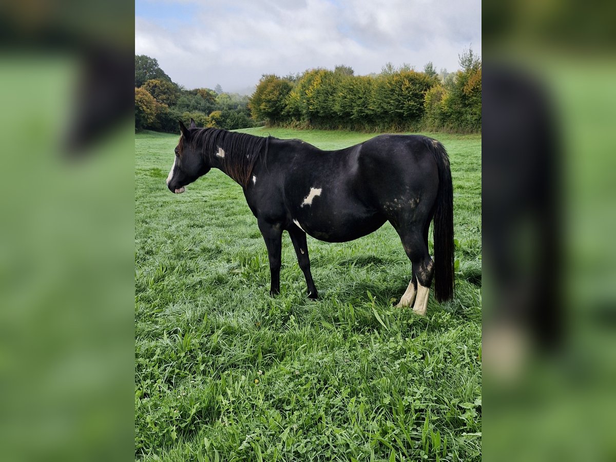 Black Overo Paint Mare, full sister of EMH TITANS STARFIRMIN, grullo tobiano, double homozygous, and in foal with her black Tovero foal.