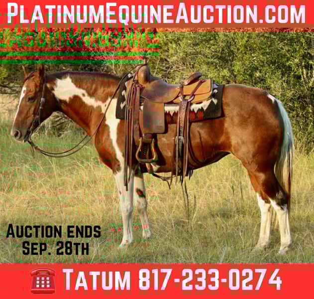 ONLINE AUCTION Place your bids at www.PlatinumEquineAuction.com Starting Bid $3500 Auction ends September 28th, 2025 Need a new saddle? Check out White Rock Saddles on our website or Facebook Some horses test you but Margaret takes care of you. This stunning 15-year-old paint mare stands at a perfect 14.3hh and has earned herself the title of bombproof in every way. From her calm, steady nature to her sweet, willing heart, Margaret is the kind of horse that makes life in the saddle simple, safe, and fun again. She’s the first one to meet you at the gate, happy to be groomed, saddled, or simply loved on. And when you climb on, she gives you the same ride every time—quiet, safe, and trustworthy. • Got kids who want to ride? Margaret will babysit them. • Nervous beginner learning the ropes? She’s patient and kind. • Want to relax after a long day? Margaret will carry you wherever you point her, no questions asked. On the trails, she’s steady and surefooted, the kind that takes you over bridges, through creeks, and down quiet country paths without so much as flicking an ear. Margaret isn’t just a horse—she’s a partner. One you can count on every single time. Located in Lipan, TX. Nationwide shipping available, including Hawaii & Canada Call or text Tatum Carlson 817-233-0274 to come meet Margaret—the horse that will make riding easy again. ONLINE AUCTION Place your bids at www.PlatinumEquineAuction.com Starting Bid $3500 Auction ends September 28th, 2025 Need a new saddle? Check out White Rock Saddles on our website or Facebook