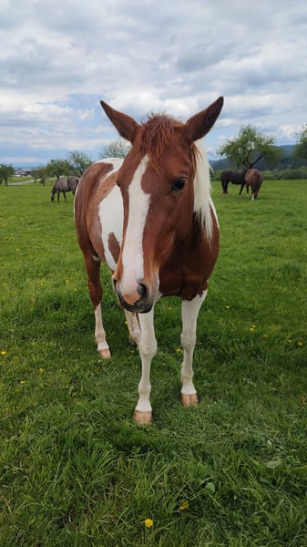 I am selling a young mare born in May 2022. She has been growing up outdoors in a mixed herd since birth. The mare is broken and has been driven in the base, but has not been ridden much due to lack of time. The mare participated on a Paint show in halter and color class classes. 6 panel test negative /HERDA, PSSM, HYPP, MH, OLWS, GBED/. Color test eeAAnT. The mare is suitable for breeding sports as well as a hobby horse. Father: CD Flyer - paint horse. Son of CD Olena - cutting champion whose offspring have earned more than 17 million dollars. Mother: Smart Little Surprise - paint horse