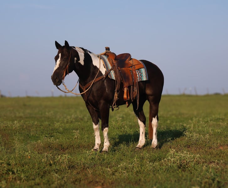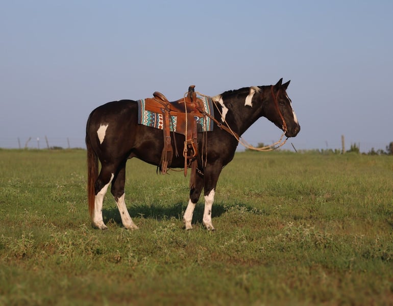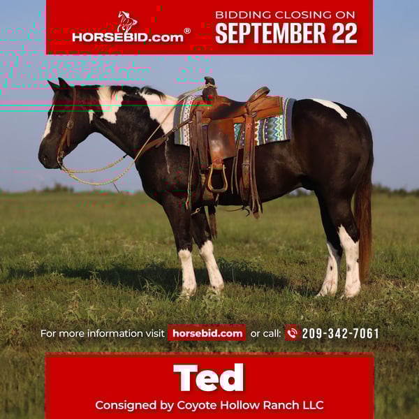 🍁𝒕𝒉𝒆 𝐅𝐀𝐋𝐋 𝑺𝒑𝒆𝒄𝒕𝒂𝒄𝒖𝒍𝒂𝒓🍁 Happening now thru MONDAY | SEPTEMBER 22nd - Available EXCLUSIVELY on HorseBid's website! For more details and to register visit: www.Horsebid.com CONSIGNOR CONTACT: Coyote Hollow Ranch LLC 209-342-7061 LOCATION: Mount Vernon TX BREED: Paint REGISTERED: No COLOR: Black and white HEIGHT: 15 AGE: 9 GENDER: Gelding Meet Ted, a seasoned black and white paint gelding who is the definition of a dependable ranch partner. This older gentleman’s horse is as solid and trustworthy as they come, with years of real-world ranch work under his belt. He’s a veteran at doctoring sick cattle, branding calves, sorting and penning, and loading trucks—always steady, always reliable. Ted is the kind you can leave turned out for a month or even six, then saddle up and ride off without a worry. He never gets fresh, fast, or anxious—always the same honest horse every single time. Out on the trail, he’ll cover any terrain you point him at, sure-footed and confident, with no hesitation. Nothing rattles this gelding. He’s completely desensitized to tarps, flags, traffic, and all the sights and sounds that might unsettle a lesser horse. Ted is also a gentleman to bathe, shoe, haul, and handle. He gets along well with other horses in the pasture and is just as content in a stall. If you’re looking for a true ranch veteran and a safe, solid partner you can count on every ride, Ted is your horse.