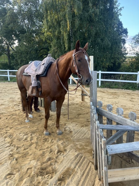 9 Jahre | ca. 1,60 m | Wallach | Paint Horse | Allround gezogen | Western geritten | Standort: 06686 Rippach (Sachsen-Anhalt) Er ist super robust und war noch nie schlimm krank oder ernsthaft lahm ! Gerne auch zur Verfügung in Leipzig Knut (Nu Collor N Slowmotion) ist ein Allround gezogener Paint Horse Wallach – vielseitig, talentiert und mit dem Herz am rechten Fleck. Schweren Herzens suche ich für meinen über alles geliebten Knut ein neues, liebevolles Zuhause. Ich besitze ihn, seit er 10 Monate alt ist. Leider kann ich ihm mit zwei kleinen Kindern zeitlich und finanziell nicht mehr gerecht werden – daher wünsche ich mir für ihn einen Menschen, der ihm die Aufmerksamkeit und Förderung schenken kann, die er verdient. ⸻ 🐎 Wesen & Haltung Knut lebt aktuell im Offenstall und kennt Boxen nur kurzzeitig (z. B. zum Putzen, Füttern oder auf Turnieren). Er ist sehr sozial, steht in der Herde im Mittelfeld und versteht sich mit Artgenossen hervorragend. Zum Menschen ist er ausgesprochen freundlich, verschmust und genießt jede Zuwendung. Knut ist ein feinfühliges, sensibel reagierendes Pferd, das seinem Menschen gefallen möchte. Er braucht jemanden, der ihm Sicherheit gibt – dann ist er ein absolut treuer Partner. Anfangs kann er etwas schreckhaft sein, vertraut er aber, lässt er sich gut führen und zeigt sich zuverlässig. ⸻ 🏇 Ausbildung & Reiten Knut ist solide westernmäßig grundausgebildet und beherrscht alle Gangarten sicher. Er ist lernwillig, aufmerksam und mit Freude bei der Arbeit. Seine Bewegungen sind schwungvoll, sein Körperbau kräftig und korrekt. Er ist nicht für den Schulbetrieb oder Anfänger geeignet, da ihn unsichere Reiter schnell verunsichern. Mit einem erfahrenen, einfühlsamen Reiter arbeitet er dagegen konzentriert, motiviert und zuverlässig mit – und wächst zu einem echten Herzenspferd heran. Im Gelände zeigt er sich in der Gruppe souverän und ist auch alleine mit einem sicheren Reiter gut zu reiten. Ab und an hat er „schlechtere“ Tage ,da ist er schreckhafter (besonders bei wind). Er hat bereits erste Turniererfahrung gesammelt und ist turniermäßig geimpft (inkl. Herpes, halbjährlich). ⸻ ❤️ Schmied & Umgang Beim Tierarzt zeigt er sich brav. Beim Schmied kann er etwas ungeduldig werden und zieht gelegentlich einen Huf weg – bleibt dabei aber stets respektvoll und gut händelbar. Er ist barhuf ! ⸻ 📍 Standort & Preis 📍 Ort: 06686 Rippach 📸 Fotos, Videos und weitere Informationen sende ich gerne auf Anfrage. Knut wird nur in allerbeste Hände abgegeben – kein Notverkauf! Ich wünsche mir für Knut ein Zuhause, in dem er die Aufmerksamkeit, Zuwendung und Liebe bekommt, die er verdient. Telefonisch bin ich ihn der Woche erst ab 17 Uhr zu erreichen und am we ab 10 uhr