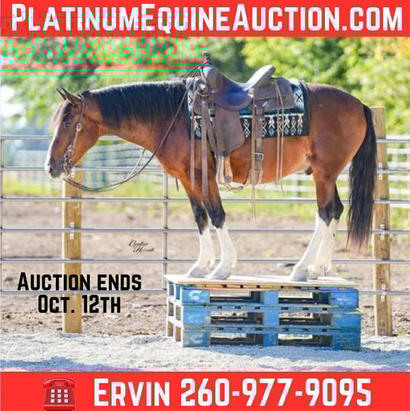 ONLINE AUCTION Place your bids at www.PlatinumEquineAuction.com Starting Bid $3500 Auction ends October 12th, 2025 Need a new saddle? Check out White Rock Saddles on our website or Facebook Clyde is a 9 year old, 13.2H, super stout built, paint pony gelding. He has been ridden every where that you could ask one to go… Lots of outside miles, down the trails, across the creeks, ditches, deadfall… he does it all! He handles any obstacles that are in his way, is safe to ride down the highways and through town as well. He rides well in the arena and does fine in a group as well as alone. He neckreins around nice, takes his leads, lopes nice circles and has a good stop. Clyde is a great size that will fit any level of rider, right down to the youngest ones yet he is stout enough to carry an adult. He is farrier friendly, he tacks up quietly and walks right off when asked after he is mounted. He has been around lots of kids and loves attention and is easy to catch as well. He absolutely does not buck, bite or kick as he is totally safe and well trained. Clyde is blemish free, has had all of his shots, and has been dewormed. He sells 100% sound and sane. We invite anyone to come see and ride him in person so they can understand how truly awesome that Clyde is! Located in Independence, IA. Contact Ervin with Platinum Star Stables 260-977-9095 with any questions. ONLINE AUCTION Place your bids at www.PlatinumEquineAuction.com Starting Bid $3500 Auction ends October 12th, 2025 Need a new saddle? Check out White Rock Saddles on our website or Facebook