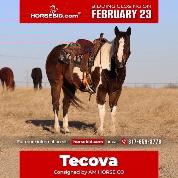 💎 𝐓𝐇𝐄 𝓓𝓲𝓪𝓶𝓸𝓷𝓭 𝐒𝐇𝐎𝐖𝐂𝐀𝐒𝐄 💎 Happening now thru MONDAY | FEBRUARY 23rd - Available EXCLUSIVELY on HorseBid's website! For more details and to register visit: www.Horsebid.com CONSIGNOR CONTACT: AM HORSE CO 817-659-3778 LOCATION: Mineral Wells, TX BREED: Paint REGISTERED: Yes REGISTERED NAME: MACARIO GOLD COLOR: Brown and his white HEIGHT: 15.1 AGE: 12 GENDER: Gelding 💛 MACARIO GOLD💛 see if he checks these few boxes for you?⬇️ 🌟An absolutely certified GENTLE, EASY AND BEAUTIFUL for any age ⭐️A horse that is handy enough but calm enough to do any job or anything you ask of him? ⭐️A horse that is perfect for someone wanting to learn or just someone wanting to ride on the weekends? 🌟The perfect gelding to ride down the trails all day long without any trouble whatsoever? ⭐️A great lesson horse? Or Drill team? Maybe a sorter? To go ranch on? Tecova isnt just a cool paint but will have you look for years to find one like this! A great pedigree come with this guy, Corona Cartel, Royal Quick Dash and more all right there on his papers! Tecova is a perfect 12 years old, 15.1 hands tall, and weighs 1200lbs! A good paint horse is hard to come by, don’t miss out on him! He will stand for absolutely anyone to get on, no matter what you’re using to get up there. He is put together correctly and is calm as you could want and a true gentleman and has a patient temperament. He is one of those all around geldings that are forgiving enough for those complete beginner riders but he is also fun for an advanced! You can’t go wrong with him for your family! Tecova is very easy, he walks, trots, lopes and side passes very well! He’s extremely smooth to ride and has a beautiful rocking chair lope each direction! We can’t say enough good things about him, and believe it or not, there is NOT one bad thing we could say. He is the very best first horse and the perfect addition to your family. I could talk about him all day long, or you could come see him for yourself! We are located in ♦️Mineral Wells Texas♦️but have reputable haulers that go all over the country, including Hawaii and Canada. Give me a call or text and I’d be happy to answer any questions! 817-659-3778