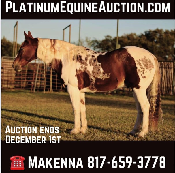 ONLINE AUCTION Place your bids at www.PlatinumEquineAuction.com Starting Bid $3500 Auction ends December 1st, 2024 Need a new saddle? Check out White Rock Saddles on our website or Facebook! Check out this amazing gelding we have had the opportunity to offer to the public, Adios! At only 11 years old, this gelding is ready to find his forever family! Nothing phases this guy as he is always eager to do is job. This horse not only looks majestic, but he rides like it too. Walk, trot, lope, this horse moves like a dream. Slide into the new week knowing that you have an absolute dream of a horse that you can show off to all of your friends. Put Grandpa on him to go check cows, put your husband on him that was reluctant to buy him but is instantly going to fall in love with him or take him to the playdays and let your kids learn on him! Not only is this horse gentle, but he is TOUGH! Need to go check pasture all day? He can do it. Need to go to the long parade where he is going to have to sit all day? He can do it. Want to take the family to the lake and play in the water? Need to have something to unwind with after work? Car broke down and need to go into town to run errands? HE CAN DO IT! Whenever we have a tough hand, we know Adios will always have our back. No matter how busy your life may get, Adios is always ready to saddle up and ride off without a care in the world! He will always meet you at the gate, especially with a little cookie interruption. Located in Lipan Texas. We can help arrange hauling anywhere in the US, Hawaii or Canada! Please call or text Makenna Hartzell 817-659-3778. ONLINE AUCTION Place your bids at www.PlatinumEquineAuction.com Starting Bid $3500 Auction ends December 1st, 2024 Need a new saddle? Check out White Rock Saddles on our website or Facebook!
