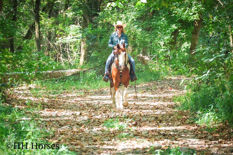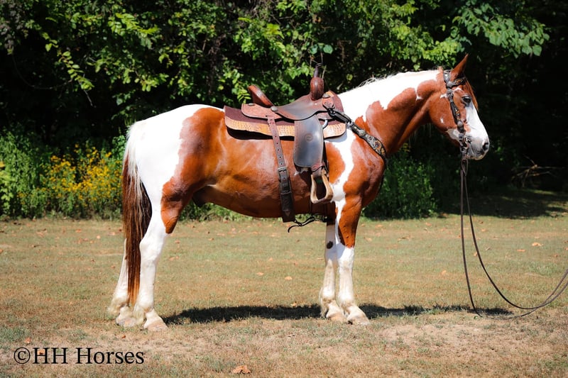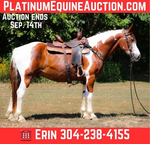 ONLINE AUCTION Place your bids at www.PlatinumEquineAuction.com Starting Bid $3500 Auction ends September 14th, 2025 Need a new saddle? Check out White Rock Saddles on our website or Facebook This is “TECUMSEH”, a loud colored, flashy, sorrel and white TOBIANO PAINT GYPSY CROSSBRED GELDING that has been used for trail riding, arena work, and ranch work. He is 3/4 Paint and 1/4 Gyspy. This gelding is a superb trail mount, he is traffic safe, and not spooky. He is stout made and stands 14.3 hands tall. He is 14 years old. He is very fun to ride, he has a smooth easy to sit jog and a collected canter. He stops easily on whoa, backs up, and walks out nicely on the trails. He will cross the water, go through the woods, and take his time up and down steep embankments. He has been used in the pastures to check cattle and fences. He rides out alone and goes willingly anywhere you point him. He is attractive, well built, has a head full of sense, and he is gentle to work around. He stands tied, loads, bathes, and hauls with no fuss. He is a cool horse with lots of style. Located in Flemingsburg, KY. Contact Erin with HH Horses 304-238-4155 with any questions or to make a Buy It Now Offer. ONLINE AUCTION Place your bids at www.PlatinumEquineAuction.com Starting Bid $3500 Auction ends September 14th, 2025 Need a new saddle? Check out White Rock Saddles on our website or Facebook