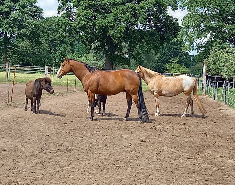 Jack is geboren in 2010, approximately 1.60 m tall. He has been with me since weaning. He is kept exclusively in an open stable and adapts very well. Currently, he is living with four mares and is the herd leader. At the age of two, I started taking him on trail rides as a ground horse, including during cattle drives. At four years old, he participated twice in professional riding lessons. Since then, he has been ridden recreationally in Western style. Unfortunately, I no longer have enough time to give him the attention he deserves. I had almost 10 years of a riding partnership with him, but my riding partner is now pregnant and will no longer be able to continue. Jack needs a person who has plenty of time to bond with him. He is familiar with ground work, longeing, arena work, and trail riding. He is barefoot and has blacksmith shoes, although he hasn't been ridden for a longer period recently. His teeth were checked in June, and his hooves are trimmed every five weeks. He is vaccinated and dewormed. A visit to the veterinarian is no problem. He does not buck, rear, or bolt. In the arena, he can be a bit lazy but works with you. My riding partner often rode him in the arena, including lessons. I mostly took him out on trail rides. Cars and tractors do not bother him. Jack is fully rideable and has no health issues. Character-wise, Jack is somewhat challenging and rather dominant. He needs a clear and confident handler. Insecure persons may find it difficult to handle him, so he is not suitable for beginners, at least not in handling. The last photo shows his sire’s pedigree. His dam was an American Paint mare without papers. See the last photos. I would like to sell him with a suitable Western saddle (California Brand Saddlery), which is included in the price. It is very important to me that he finds a good new home where he can grow old. Further information gladly by phone. This is absolutely not an emergency sale, and his future is very important to me. Price is negotiable, place takes priority.