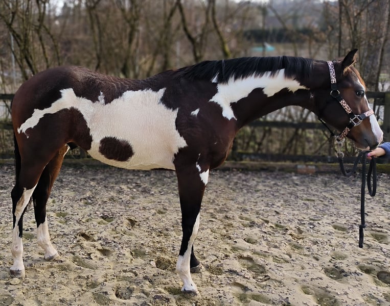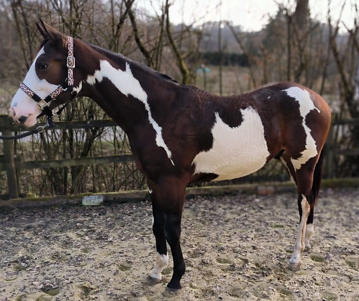 Marzycielsko pięknie wybarwiony ogier American Paint Horse z 07/24 w kolorze bay overo, z ładną, małą głową i ciemnymi oczami. Dobrze umięśniony, o harmonijnej budowie ciała. Obecny wzrost to 151 cm, ale nadal rośnie. Spokojny i bardzo przywiązany. Dobre chodzenie. Z dokumentami APHA i paszportem konia, zaszczepiony i odrobaczony. Dla tych, którzy cenią coś wyjątkowego!