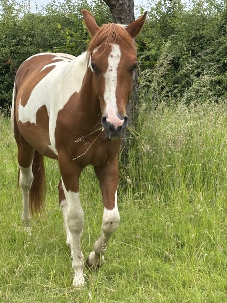 Deze knappe, zelfverzekerde jonge ruin is op zoek naar een persoon die met hem aan de slag wil gaan. Hij woont met zijn moeder en nog 2 oudere paarden in een paddock, in de regio Zuid Limburg Nederland, ca 25 min van Aken en Luik. Hij heeft vanaf dag 1 altijd beweging gehad en is op een paardvriendelijke manier opgeleid in de simpele dingen die een paard op zijn leeftijd hoort te kennen. Hij is licht in de hand, leert snel en gaat met zijn trainer alleen op wandeling. Hij kijkt niet op of om. De training bestaat nu voornamelijk uit wandelingen zonder andere paarden, losjes meelopen, wennen aan alles wat op zijn pad komt en dagelijkse dingen zoals achteruit op lichte aanwijzing, schouders en achterhand verplaatsen. Ook snapt hij de beginselen van clickeren. Hij is nu 2e in rang en daarom is het belangrijk dat hij in een groep komt te staan waar hij niet te snel omhoog klimt, daar is hij te jong voor. Een speelkameraadje voor hem zou ideaal zijn. Boxopsluiting kent hij niet en dit zou ik ook niet willen voor hem. In de groep is hij over het algemeen rustig en komt nieuwsgierig naar je toe. Hij komt dagelijks in de hand. Ben je op zoek naar een maatje voor het leven en heb je de kennis en kwaliteit met een jong paard aan de slag te gaan? Dan hoor ik graag van je. Met de juiste opleiding en geduld zal hij een perfect rijpaard worden. Hij is niet bang aangelegd en vrij zelfverzekerd maar moet nog verder opgeleid worden. Hij is nu 150 cm maar zal nog groeien. Geboren 03-05-2023. Moeder April Secret Moonfire 5 panel negatief. Vader Rolex Sparklin Pine 7 panel negatief. Tobiano Vos. APHA Stamboom. Nederlands paspoort. Prijs zoals voor dit ras en deze leeftijd gebruikelijk is, op aanvraag.