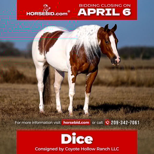 🌟𝑨𝒑𝒓𝒊𝒍 𝐀𝐋𝐋 𝐒𝐓𝐀𝐑 𝐋𝐈𝐍𝐄𝐔𝐏🌟 Happening now thru MONDAY | APRIL 6th - Available EXCLUSIVELY on HorseBid's website! For more details and to register visit: www.Horsebid.com CONSIGNOR CONTACT: Coyote Hollow Ranch LLC 209-342-7061 LOCATION: Waco, TX BREED: APHA REGISTERED: Yes REGISTERED NAME: VALENTINES JUSTINTIME COLOR: Sorrel Tobiano HEIGHT: 14.1 AGE: 6 GENDER: Gelding Dice — roll the right one every single time. Dice is a 2020 APHA gelding, bred to work and built to perform: This One Time x Smartlittlevalentine x JR Red Diablo. If you’re looking for a Paint gelding that turns heads and backs it up with real ability, Dice checks every box. Dice has been shown successfully in the Open Cow Horse during the 2024 and 2025 seasons, and has marked 219s down the fence. He is Non Pro and lower-level Open suitable, making him a great fit for a wide range of riders looking for talent without hassle. In the arena, Dice is a huge stopper with a smooth, correct turnaround that gets noticed. He’s confident and honest in the boxing and reads a cow naturally down the fence, staying hooked and consistent the entire run. He’s smooth, correct, powerful, and genuinely fun to show. Show highlights include: Reserve Champion – Level 1 Open Derby, Wild Rag Classic 2025 – Top 5 – APHA World Show 2025, Junior Cow Horse. Outside the arena, Dice is just as solid. He’s been roped the sled on, drug calves, used extensively in the sorting pens, and gathered cattle in the pasture. He’s dependable, gritty when needed, and understands a day’s work. No drama—he shows up the same every ride. Despite his ability and cow sense, Dice is easy to get along with, kind, and forgiving. He’s the type that builds confidence in his rider while still having plenty of gear for the show pen. He requires no special maintenance and is straightforward to keep and ride. Dice is that rare combination: pretty, broke, cowy, gentle, and useful. Whether you’re headed to the cow horse pen, working cattle, or just wanting a high-quality, trustworthy gelding, Dice is the kind you’re proud to own and ride. If you want to load the dice in your favor — Dice is the one. (209)-342-7061 X-rays and vet exam attached.