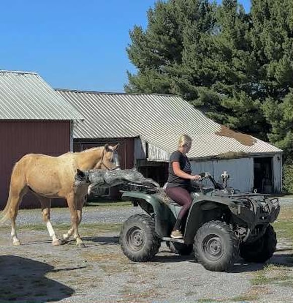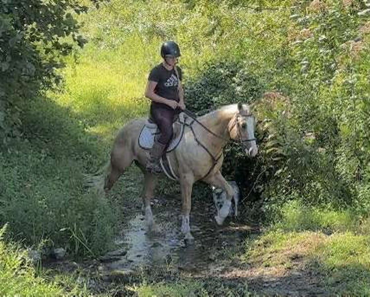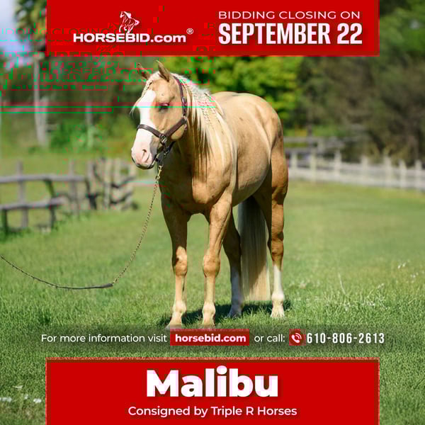 🍁𝒕𝒉𝒆 𝐅𝐀𝐋𝐋 𝑺𝒑𝒆𝒄𝒕𝒂𝒄𝒖𝒍𝒂𝒓🍁 Happening now thru MONDAY | SEPTEMBER 22nd - Available EXCLUSIVELY on HorseBid's website! For more details and to register visit: www.Horsebid.com CONSIGNOR CONTACT: Triple R Horses 610-806-2613 LOCATION: New Holland, PA BREED: APHA paint REGISTERED: Yes REGISTERED NAME: Freckled Intoxication COLOR: Palomino HEIGHT: 15 AGE: 5 GENDER: Gelding “Freckled Intoxication” aka “Malibu” is a 5yr old, 15hh, APHA gelding, with a lush mane, beautiful palomino coat, and chocolate freckles all over his body. Mali is safe, reliable, and Mr. Personality! He is an in your pocket type of dude with loads of character. Malibu can do it all, and he is ready to be your best friend! Do it all, and do it safely! In the barn, he has zero bad habits. He can live in or out, goes out with others and can live alone. He has no bad stall habits and is quiet while stalled. He stands on the cross ties to be groomed, tacked, bathed, etc. He straight ties to the trailer to get ready. Mali is a happy go lucky guy, and loves attention. He is safe with kids and dogs running around him, cows standing with him, you name it. He is totally unbothered and knows how to take a joke! He is an easy keeper with a simple diet, no maintenance and no supplements. He is good for the vet and farrier, and can wear shoes or go barefoot. He walks up to you in the pasture and is easy to catch. He likes being around people and will make you giggle with his silly personality. Malibu loves trail riding. He will lead, follow, go alone and in groups. He has a nice steady walk pace, and will trail ride on the buckle all day long. He is safe with traffic, bikes, strollers, wildlife and doesn’t mind my dogs trailing his heels. He crosses logs, rocks, water, and will wait for you at the porta potty. He would make a great camping partner or fox hunter. He even has the personality of a husband horse. He is always up for a good adventure, pack your saddle bags full of beer and go enjoy your ride. Malibu rides western, english, and bareback. He is soft in your hands and rides in a simple snaffle, or even a halter and lead rope! His gaits are comfortable and uphill. He has smooth transitions and listens nicely to your cues. He is a blast to ride, and the same horse every ride. Mali is the safe horse that your kids can go jump on in the pasture and he will take care of them. In the ring, Mali will walk, trot, canter, knows his leads, and loves to jump. He will ride collected or on the buckle. Malibu backs up nicely, pivots, side passes, neck reins, moves off of your leg, and you can ask for a big whoa, or bring him down smoothly through the gaits. He shows a lot of potential for ranch classes, low level reining fun stuff, cows, western dressage and more. He trots nicely through ground poles and is careful of where he puts his feet. He will ride off of your seat, or voice commands. Mali is forgiving and doesn’t get upset if his rider is off balance. He is just always a happy guy and enjoys every ride. Malibu enjoys jumping too! He will pop over tiny cross rails gently, or jump larger jumps and cross country fences too! He is a natural over fences and is very good with distances. He does not get hot or forward while jumping. You’ll see how honest he is in the clips of my pup jumping the cross country jumps with us. Malibu is a beautiful mover, and could go dabble in low level dressage, eventing, or maybe you just want a horse that will take care of you while you work on yourself! No matter what direction you want to take him in, he is happy to do it, or go have fun and do IT ALL!!!!! Malibu is registered with APHA. He is sired by “Intoxication” who is a beautiful stallion who has points in halter and western pleasure, who goes back to “Mighty Awesome”, a stallion who was known for his championship breeding and impact on APHA. On Mali’s bottom side, back in his lines you will see “Sonny Dee Bar”, a famous stallion who is a leading sire of show horses, known for producing great dispositions and natural talent. He was inducted into the AQHA Hall Of Fame in 2003. Malibu’s breeding speaks for itself, and has created an amazing all around boy. No matter what you are looking to do, Malibu is ready to be your forever partner and do it with you. I have really enjoyed my time with this boy. He is currently set up to head in absolutely any direction. Not to mention, he is easy on the eyes! If Malibu sounds like a good match for you, please don’t hesitate to reach out for further information!!! Shipping can be arranged anywhere.