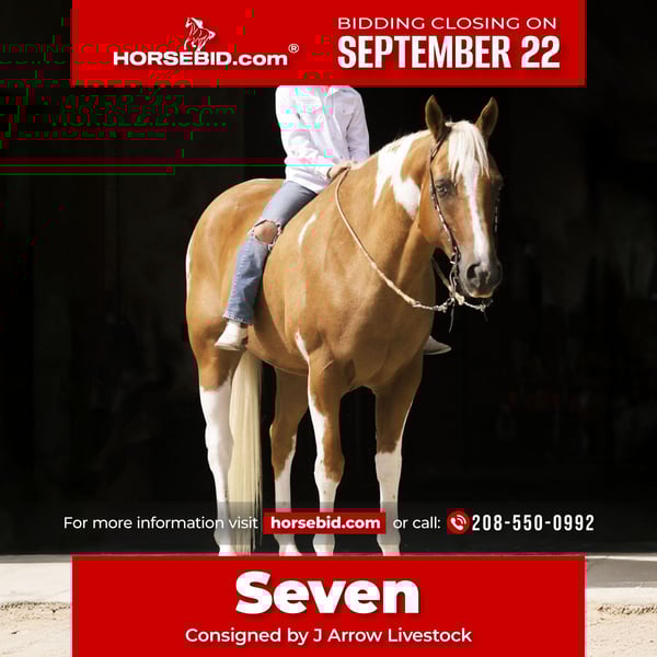 🍁𝒕𝒉𝒆 𝐅𝐀𝐋𝐋 𝑺𝒑𝒆𝒄𝒕𝒂𝒄𝒖𝒍𝒂𝒓🍁 Happening now thru MONDAY | SEPTEMBER 22nd - Available EXCLUSIVELY on HorseBid's website! For more details and to register visit: www.Horsebid.com CONSIGNOR CONTACT: J Arrow Livestock 208-550-0992 LOCATION: Caldwell idaho BREED: Apha REGISTERED: Yes REGISTERED NAME: Tn seven come eleven COLOR: Paint HEIGHT: 14.3 AGE: 7 GENDER: Gelding Seven is a rare opportunity he’s absolutely beautiful to look at, very gentle and has been exposed to lots of situations. He’s an amazing trail partner seven walks out nice and is very smooth traveling. He’s is safe in all situations out on the ranch or trails you can’t get him in a wreck! Seven has been up in the mountains a bunch he knows what steep hills, trees and lots of rocks are. He will cross water, deadfall and rough terrain willingly. In the arena seven is a good rope horse you can head heel or breakaway on him. He’s mostly been heeled and breakaway roped on. Great for the lower numbers he’s VERY CALM! Run five or fifty he don’t care my son has enjoyed heeling lots of steers and breakawaying on him. Definitely more of a push stile horse he doesn’t ever get hot or jiggy! Would be a great 4h or queen horse, he will pack flags and isn’t spooky. Seven has a very smooth rocking horse lope with a nice easy to ride trot. Show him something new and he will do it. He will last your family and longtime and be a true asset to your ranch! Fmi please call 208-550-0992