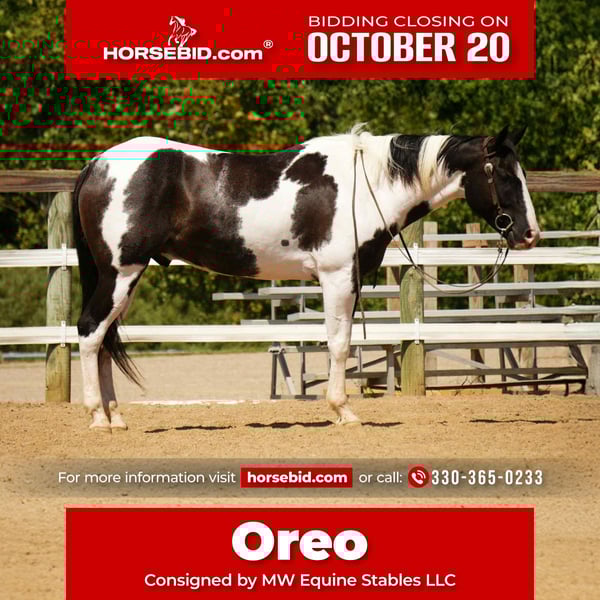 ♦️ 𝐭𝐡𝐞 𝐀𝐌𝐄𝐑𝐈𝐂𝐀𝐍 𝓕𝓪𝓵𝓵 𝓒𝓵𝓪𝓼𝓼𝓲𝓬 ♦️ Happening now thru MONDAY | OCTOBER 20th - Available EXCLUSIVELY on HorseBid's website! For more details and to register visit: www.Horsebid.com CONSIGNOR CONTACT: MW Equine Stables LLC 330-365-0233 LOCATION: Fresno, OH BREED: Paint REGISTERED: No COLOR: Black & White HEIGHT: 15.1 AGE: 7 GENDER: Gelding 💥Oreo is a 7 yr old paint gelding that with the best color and conformation ever.. This guy stands 15.1 HH and is an absolute Sweetheart.. Super Versatile, Rides English,Western, amazing trail horse.. and could excell as an amazing Hunter Jumper.. Oreo is the perfect babysitter for the whole family. Whether it’s the grandkids or beginner riders, he’s the one you can trust. In the barn, Oreo is as sweet and gentle as they come. He’s quiet to handle, stands nicely for grooming, and gets along with all the farm life — dogs, kids, you name it. Under saddle, he’s dependable and uncomplicated, safe for any level of rider. He’s trail-savvy, willingly crossing logs, creeks, ditches, and navigating any obstacle without hesitation. He will walk, trot, and canter effortless circles, but his happy place is strolling steadily down the trail, carrying his rider with confidence and care. Well-build, beautifully marked, and flashy, Oreo turns heads wherever he goes. He’s clean, sound, and vice-free, plus easy to shoe, load, and haul. If you’re looking for a fun, willing, and trustworthy gelding who’s as pretty as he is kind, Oreo is ready to be your family’s favorite. ☎️ Contact Marcus for more info 330-365-0233