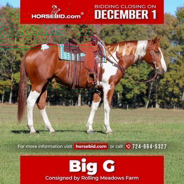⚜️ 𝓽𝓱𝓮 𝐇𝐨𝐫𝐬𝐞𝐦𝐚𝐧'𝐬 𝓢𝓱𝓸𝔀𝓬𝓪𝓼𝓮⚜️ Happening now thru MONDAY | DECEMBER 1st - Available EXCLUSIVELY on HorseBid's website! For more details and to register visit: www.Horsebid.com CONSIGNOR CONTACT: Rolling Meadows Farm 724-664-5327 LOCATION: Morriston FL BREED: APHA REGISTERED: Yes REGISTERED NAME: Grans Diamond G COLOR: Sorrel and white HEIGHT: 16.2 AGE: 7 GENDER: Gelding Introducing Grans Diamond G, Or as we like to call him Big G! Big G is an eye catching sorrel and white Tobiano paint gelding with unique markings and a beautiful build! He is registered with the American Paint horse Association and is 7 years old. He is a thick built boy made to carry any sized rider any where they want to go. He has great legs and feet that are built to last. Big G has been used as a ranch horse in South Dakota where he did all aspects of ranch work. He is very very well broke any level of rider will appreciate him. He has a soft one hand easy neck rein, he gives nicely to leg pressure, side passes both directions easily. Walks on a loose rein and Trots smooth and collected. He will pick up both leads at a lope and has a nice stop and back up. Big G will open and close gates, stand to be mounted and go all day on the trails! He has spent most of his time out on the trails or working the ranch moving cattle but he is also a fantastic arena horse he would make a nice lesson horse or even show horse. Big G has a great mind and a willingness to learn. He could go western or English. When it comes to ground manners Big G is a kind respectful boy. He leads nice and quiet and is friendly. He picks up all 4 feet with ease and baths, tacks, loads and stand tied. I have taken Big G on many miles of trails alone or with other riders and he’ll lead and follow. He goes thru the mud over the high logs and rough terrain with ease. Big G has a current passed Veterinarian Health Exam, Coggins and vaccinations. Please contact me if you have any more questions regarding Big G! LeeAnn -724-664-5327 thank you and have a wonderful day!