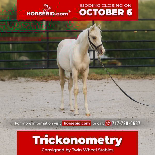 🍂 𝓐𝓾𝓽𝓾𝓶𝓷 𝑨𝑳𝑳 𝑺𝑻𝑨𝑹 𝑳𝑰𝑵𝑬𝑼𝑷 🍂 Happening now thru MONDAY | OCTOBER 6th - Available EXCLUSIVELY on HorseBid's website! For more details and to register visit: www.Horsebid.com CONSIGNOR CONTACT: Twin Wheel Stables 717-799-0687 LOCATION: New Holland PA BREED: AQHA REGISTERED: Yes REGISTERED NAME: Trickonometry COLOR: Palomino HEIGHT: 14.3 AGE: Weanling GENDER: Colt