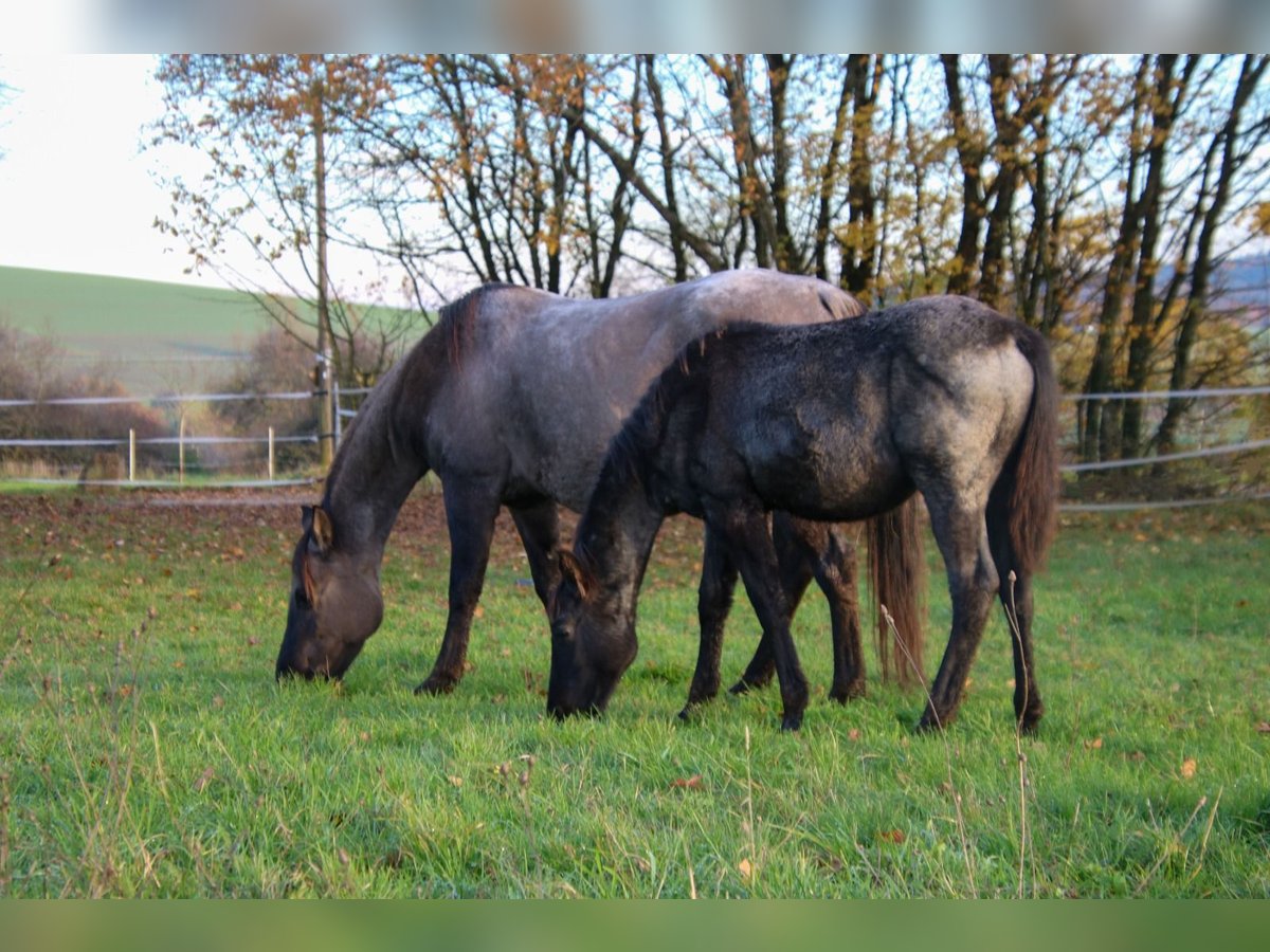 Just Be Blue Sky - dieser bildhübsche Quarter Horse Hengst, geboren am 9.4.2025, beeindruckt in der auffälligen Farbe Blue Roan und wird voraussichtlich ein Endmaß von 150 bis 154 cm bekommen. Homozygot für black. Blue ist über seine Eltern 5-Panel n/n. Er wächst gesund und artgerecht im Herdenverband mit anderen Jungpferden auf. Bei Abgabe wird er altersgemäß geimpft und entwurmt sein. Kennt dann den Tierarzt und den Hufschmied. Mit seinem lieben Charakter verzaubert er die Umwelt. Ist verschmust sowie cool und erkundigt gerne seine Umwelt. Blue wird täglich gehändelt und benimmt sich dabei brav und unkompliziert. Beim Toben zeigt er jetzt schon seine tollen Bewegungen. Dank seiner guten Allround Abstammung wird er sich voraussichtlich sehr gut für den Sport oder/und als treuen Freizeitbegleiter eignen. Wird mit vollen AQHA Papieren und Equiden Pass abgegeben.