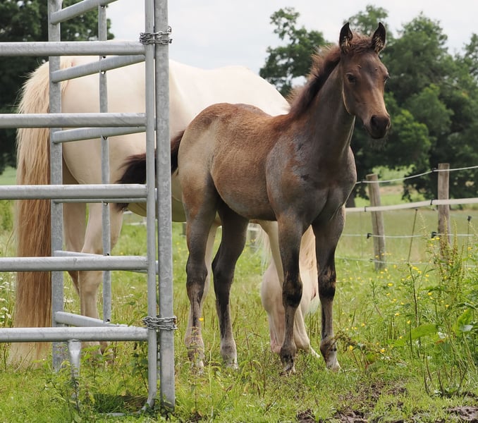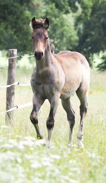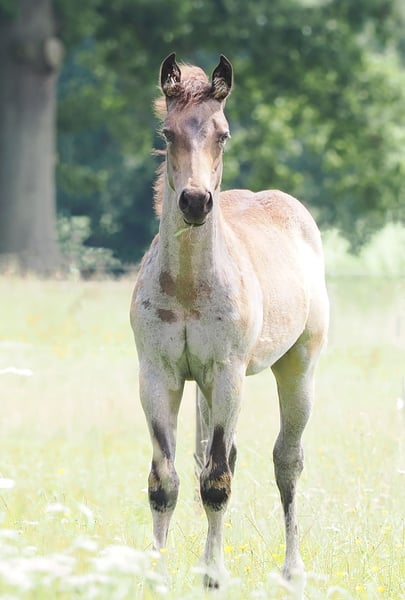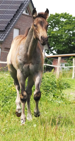 Stallion foal 05.2025 by MJM Saltys Blue Ezra, out of Champagne Pearl in Buckskin Roan. With an athletic build and a very loving nature, he is looking for a 5-star home where such a wonderful boy will be appreciated. He is sure to become a reliable partner for his rider, providing a lot of joy.