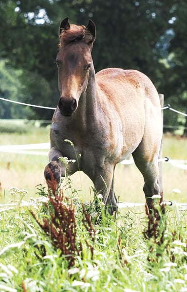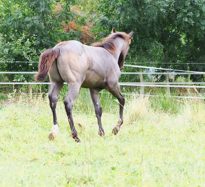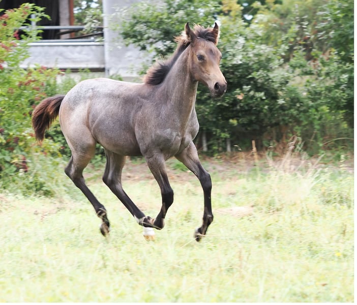 Potro macho 05.2025 de MJM Saltys Blue Ezra, de la Champagne Pearl en Bukskin Roan. Con una construcción corporal atlética y un carácter muy amable, está buscando un hogar de 5 estrellas donde se aprecie a un chico tan maravilloso. Seguramente será un compañero confiable para su jinete, que brindará mucha diversión.