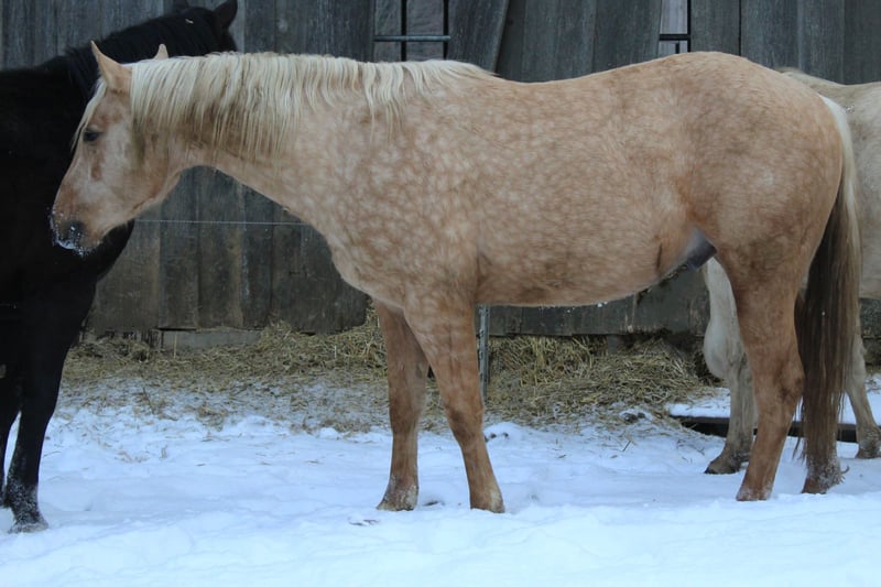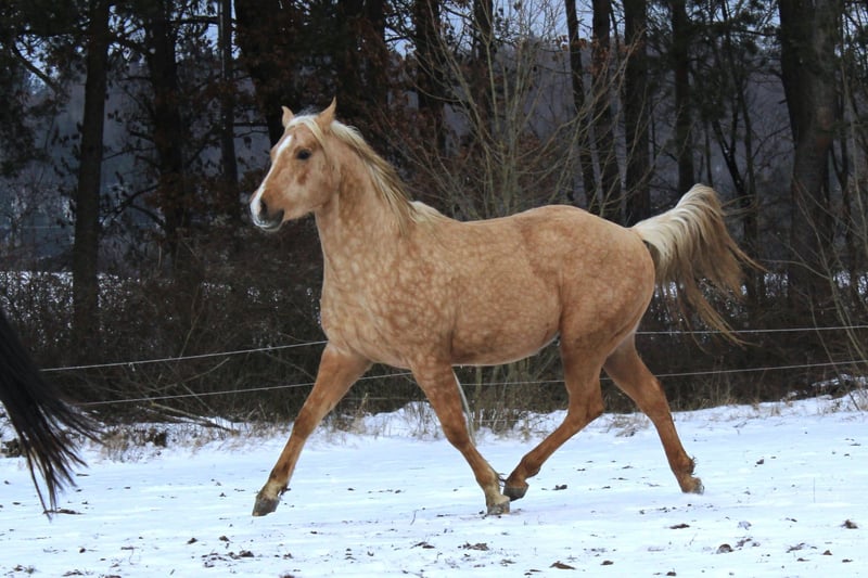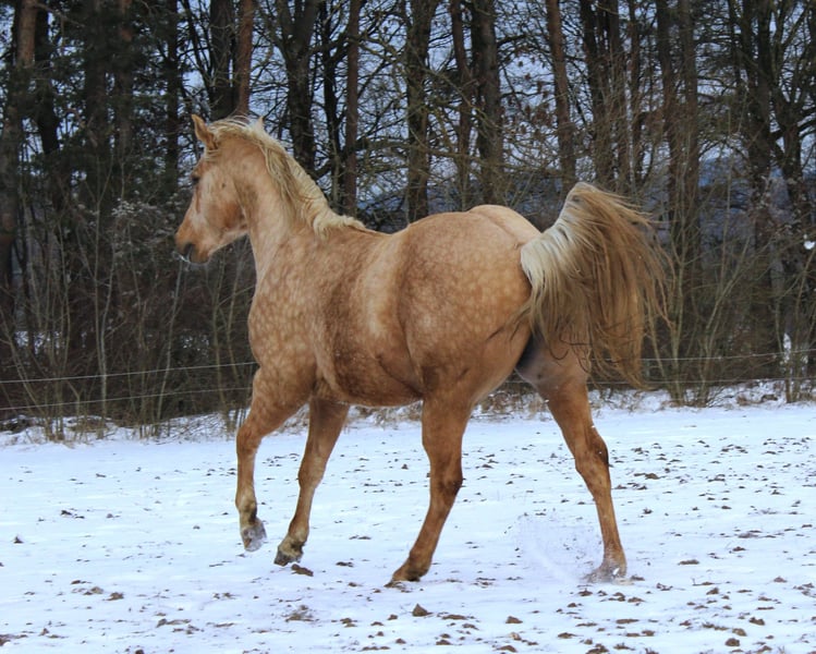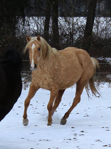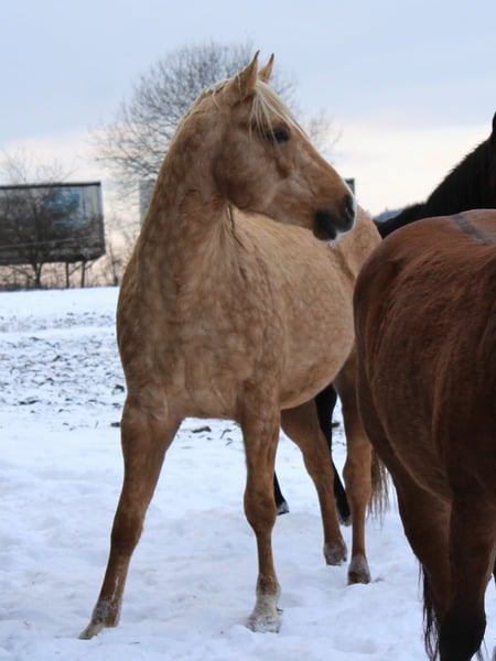 Hübscher QH Hengst Palomino geb. 04/2023 Aktuell ca. 1,48m groß AQHA Papiere und DQHA Pass Aufgewachsen im Herdenverband in 24 Std. Weidenhaltung auf unterschiedlichen Koppeln an Straßen, Wald und Wanderwegen und Laufstall mit Koppelgang, dadurch sehr gut sozialisiert und trittsicher. Neugierig und aufgeschlossen, freundlich und ehrlich, fein und aufmerksam. Durfte in Ruhe und mit Spielkameraden groß werden und auf weitläufigen Flächen toben. Kennt geputzt werden und Hufe geben, das Gelände durch das am Halfter geführte Versetzten, zusammen mit der restlichen Herde, ansonsten roh und unverbraucht. Könnte auf Wunsch zur weiteren Aufzucht noch vor Ort stehen bleiben oder auch zeitnah seine Köfferchen packen. Bei Interesse kann er gerne kennengelernt und angesehen werden.