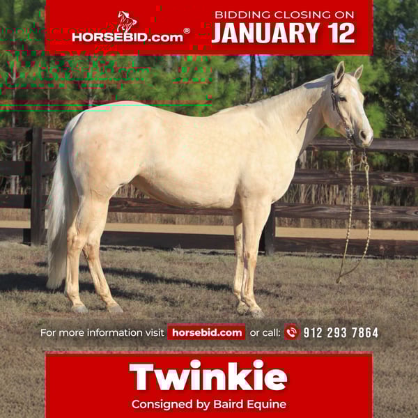 ♦️𝐍𝐄𝐖 𝐘𝐄𝐀𝐑'𝐒 𝑬𝒙𝒕𝒓𝒂𝒗𝒂𝒈𝒂𝒏𝒛𝒂♦️ Happening now thru MONDAY | JANUARY 12th - Available EXCLUSIVELY on HorseBid's website! For more details and to register visit: www.Horsebid.com CONSIGNOR CONTACT: Baird Equine 912 293 7864 LOCATION: Vidalia, GA BREED: AQHA REGISTERED: Yes REGISTERED NAME: Olenas Twinkie COLOR: Palomino HEIGHT: 15.1 AGE: 10 GENDER: Mare "✨ OLENAS TWINKIE 2015 AQHA / APHA / ARHA Registered Palomino Mare ✨ If you’re searching for a proven horse with talent, presence, and cow sense, “Twinkie” is one to notice. Stunning 3× PHBA Reserve World Champion in Ranch Rail. By World Champion producing sire Poco Dot Lena (by the great Gallo Del Cielo) and out of a granddaughter of Shining Spark. She is 100% sound, correct, and built to last. This mare has the biggest heart and wants to please. She has enough try and motor to go all day and not give up on you. She is kind natured and has been around kids and dogs. Twinkie is very good on cattle — naturally cow-smart, quick-footed, and confident. She reads a cow easily and stays honest. She has a big, expressive trot that stands out in the pen—she has extensive training and is ready to show in the ranch events, boxing, ranch cutting, and ranch reining. She has been started in roping and loves to chase a cow. She has the look, movement, and training to be a competitive show partner or a dependable ranch hand. She is 5-panel tested and negative for all and N/GBED. With breeding like this she will make an incredible broodmare when she is done with her show career. Highlights: • 🏆 3× PHBA Reserve World Champion • 🐎 AQHA / APHA / ARHA Registered • ✨ Eye-catching palomino • ✅ Sound, sane, and dependable • 🐄 Strong cow horse with natural ability • 🏇 Big trot and correct movement • 🎯 Ready to show in Ranch classes & Ranch Reining This is a quality mare with a resume— whether you’re headed to the show pen or need a capable cow horse at home. She loves a job and is happiest when she's doing her job. She would also be great for an all day ranch horse or turn back horse. Twinkie is up to date on everything and ready to go! Twinkie is at her peak with a low starch diet and vitamin b supplement to prevent mild weaving.