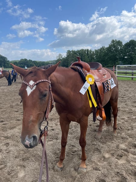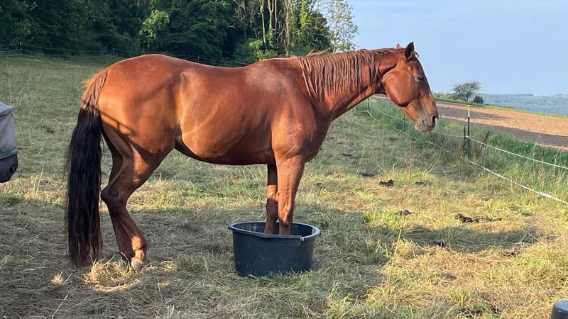 TFR A Blaze Of Glory ist eine bildhübsche, großrahmige und korrekt gebaute Quarter Horse Stute. Sie wurde im Januar 2016 geboren, ist chestnutfarben und hat ein Stockmaß von ca. 163 cm. \"Eve\" ist eine Stute mit einem ganz lieben Charakter. Sie ist sehr menschenbezogen, freundlich und neugierig und zeigt sich im täglichen Umgang stets unkompliziert und gelassen. Im Handling ist sie sehr brav und angenehm. Eve ist schmiede- und verladefromm, geimpft und regelmäßig entwurmt. Eve kennt sowohl Boxenhaltung mit Paddock und Weidegang als auch Offenstallhaltung und ist sehr sozial sowie herdenverträglich. Unter dem Sattel zeigt sie sich ruhig, brav und angenehm zu reiten. Sie verfügt über weiche, gute Gangarten und ist sehr bequem zu sitzen. Auch Reitfehler verzeiht sie, weshalb sie sich ebenfalls gut für Anfänger eignet. Gleichzeitig bringt sie viel Lernwillen und Talent mit und kann auch einem ambitionierten Reiter viel Freude bereiten. Sie ist fein an den Hilfen und gut ausgebildet. Eve besitzt eine sehr gute Westernausbildung und wurde kontinuierlich von Trainern gearbeitet sowie auf verschiedenen Kursen weiter gefördert. Sie wurde bereits erfolgreich in Ranch Riding, Ranch Rail, Trail, Pleasure und Horsemanship geshowt. Mit dem fliegenden Galoppwechsel wurde begonnen, dieser ist jedoch noch nicht vollständig sicher. Auch im Gelände zeigt sie sich stets ruhig und unkompliziert, selbst wenn sie alleine unterwegs ist. Bei ihr wurde 2020 als Zufallsbefund bei einer AKU Spat festgestellt, womit sie bisher jedoch keinerlei Einschränkungen oder Lahmheiten gezeigt hat. Röntgenbilder können selbstverständlich eingesehen werden. Im Jahr 2025 wurde zusätzlich auf beiden Vorderhufen ein Hufrollenbefund festgestellt.Sie erhielt eine Stammzellentherapie, die sehr gut angeschlagen hat, sodass sie seitdem lahmfrei ist. Vorne läuft sie mit Spezialbeschlag, hinten barhuf. Diverse Röntgenbilder sowie eine AKU können eingesehen werden. Eve ist ein tolles Pferd für einen Reiter, der sich von ihrer Diagnose nicht abschrecken lässt und weiterhin mit ihr arbeiten möchte. Ob als Turnier- oder zuverlässiger Freizeitpartner - sie ist einfach ein liebes Pferd.