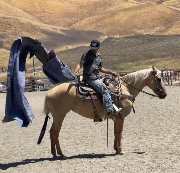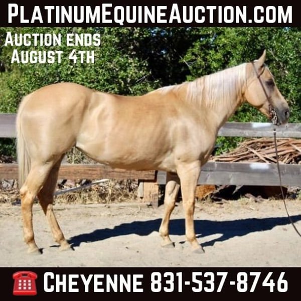 ONLINE AUCTION Place your bids at www.PlatinumEquineAuction.com Starting Bid $3500 Auction ends August 4th, 2024 Need a new saddle? Check out White Rock Saddles on our website or Facebook! Dior is as golden as her name! This fancy looking dunalino is sure to catch eyes everywhere you go! At just 9 years old and 14.3HH she is the perfect match for any family! Dior is patterned on all the JR rodeo events and has the brains for any level rider. She has runs a beautiful barrel pattern at any speed you would like and never gets hot at the gate or at the rodeo. She’s been breakaway roped on as well as heeled on. Dior is easy to ride with a touch of a rein she will go anywhere you direct her. She is the most unphased horse anywhere I have taken her. Nothing, and I mean NOTHING will get her nervous or spook her. She is steady and attentive at all times. She has a very pleasing handle, gentle motion, easy cues, and nice smooth gaits. She is naturally “cowy” and loves to work cattle. Making her a great asset in the ranch or farm world as well. Out on the trails she will lead the herd, be in the middle of the pack, or at the end, doesn’t matter to her. She crosses water, brush and walks up the steps without zero hesitation. Dior is an absolute pleasure to be around and loves her people. She will meet you at the gate, excited to join you in a ride. She is good with clippers, stands for the farrier, and will load in any trailer effortlessly. Dior is as pretty as one can be, also as enjoyable as a horse can get. No matter your riding discipline, age or size, when you get her home you are sure to LOVE her. She is located in Bitterwater, CA. For more info or schedule a time to see his sweet girl, contact Cheyenne Rey 831-537-8746. ONLINE AUCTION Place your bids at www.PlatinumEquineAuction.com Starting Bid $3500 Auction ends August 4th, 2024 Need a new saddle? Check out White Rock Saddles on our website or Facebook!