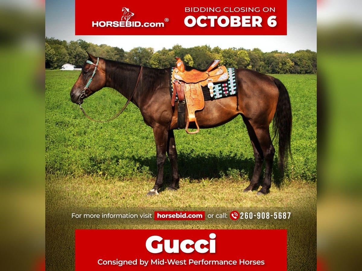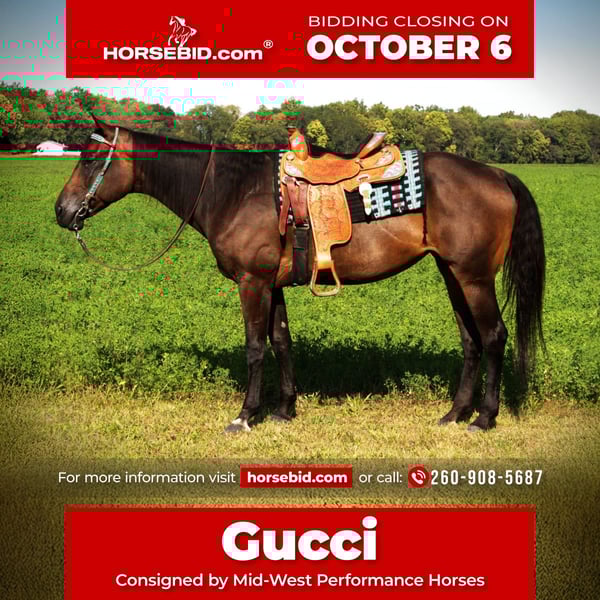 🍂 𝓐𝓾𝓽𝓾𝓶𝓷 𝑨𝑳𝑳 𝑺𝑻𝑨𝑹 𝑳𝑰𝑵𝑬𝑼𝑷 🍂 Happening now thru MONDAY | OCTOBER 6th - Available EXCLUSIVELY on HorseBid's website! For more details and to register visit: www.Horsebid.com CONSIGNOR CONTACT: Mid-West Performance Horses 260-908-5687 LOCATION: Saint Joe, IN BREED: Quarter Horse REGISTERED: Yes REGISTERED NAME: A New Song To Sing COLOR: Dark Bay HEIGHT: 16.3 AGE: 10 GENDER: Mare I’m privileged to offer you the opportunity to own this majestic, flashy mare! Meet “Gucci”. Gucci is a 10 year old registered Quarter Horse mare, standing a stout 16.2 hands tall, weighing in around 1,250 pounds. Dont let her size fool you she is a barn favorite with all the kids and has been riddin by a 5 year old! Gucci exceeds all expectations in every direction. This honest mare will take you in any direction, wherever you need to go, she's there. Her phonomal disposition and excessive willingness to please makes her the perfect family horse. Gucci has had professional, extensive training and is truly push button. She is 100% desensitized with anything you could imagine, balls, tarps, whips, flags, obstacles, cows, dogs and semis. Gucci is 100% TSS. She has been ridden on main highways and through town with flags whipping and never misses a beat. Gucci is 100% neck reined as well as 100% leg pressure trained, either way you choose to ride, she's always on point. She is a master on the trails as well as in the arena. Absolutely nothing bothers her. Gucci is the same every day, you can leave her sit for months and she will be the same horse when you choose to get her out again, guaranteed. Gucci loves water and is always confident in any situation you put her in on the trails. She crosses logs, over bridges, down the steepest hills, and up the roughest terrain with ease. You can ride Gucci western, English, bareback, double, you name it she will accept it! Gucci has exceptional transitions, with the smoothest trot and rocking chair lope! She stands great for the ferrier, and to be bathed. She hauls like a dream, you dont even know is back there. She has no vices or bad habits. She rides out alone or with large groups of people and strange horses. Gucci has NO spook or buck and gets along great with other horses. Gucci is 100% kids safe and would excel with any child or adult. Shes easy enough for the kids and perfect for any adult. Gucci has been in the show pen and has done exceptionally well. She is a definitely show ready! Gucci does great at jumping, as well as english pleasure, english equitation, trail ect. She is a great western pleasures horse as well. Gucci is definitely a must to come check out! Please contact for more information or to set up a visit! I can arrange our own personal transportation to in sure Sterling gets to your facility safely. Located in Saint Joe, IN. For more info contact April with Mid-West Performance Horses 260-908-5687.
