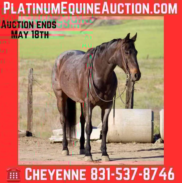 ONLINE AUCTION Place your bids at www.PlatinumEquineAuction.com Starting Bid $3500 Auction ends May 18th, 2025 Need a new saddle? Check out White Rock Saddles on our website or Facebook! Bunny is a 11 year old, 15.1HH gorgeous blue/bay roan mare. You are guaranteed to fall in love with bunny the first time you ride her! She is laid back, fancy broke and safe! Bunny has been exposed to everything you can think of! She has been one of the barn favorites, with her sweet disposition and willingness to please. She’s been rode down many busy hiking trails, crosses water, and goes without refusal anywhere you point her. She does not get buddy sour or scared under any circumstance. She will take care of the beginners or let the more advanced rider show off and have some fun! She has been a trusted companion to do a long days ranch job. Bunny absolute favorite thing is anything to do with cows! She had a lot of cow sense to her and will sort a cow! She has been roped off of outside, branded on and started roping in the arena. She is so fun and easy to ride for most anyone. She catches both leads. Has a low collected head set. Spins, and pivots in the correct way. She has carried flags at rodeos, not afraid of banners, loud noises or chaos. She can be trusted in all situations. Bunny is a friendly horse and not marish at all. She can be left off and you can trust she will always be the same horse you put away not matter how long she’s sat. She loads and hauls perfectly, great for farrier and stands tied quietly. This is a beautiful mare, that is just as sweet as she looks! Bunny is located in Bitterwater, CA. For more info or to come out and see her, please contact Cheyenne Rey at 831-537-8746. ONLINE AUCTION Place your bids at www.PlatinumEquineAuction.com Starting Bid $3500 Auction ends May 18th, 2025 Need a new saddle? Check out White Rock Saddles on our website or Facebook!
