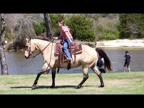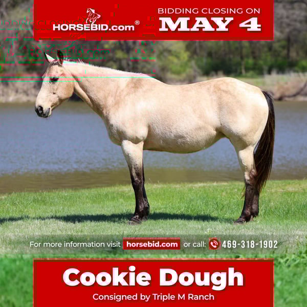 ▪️▫️◾️𝐭𝐡𝐞 𝑴𝒂𝒚 𝐒𝐞𝐥𝐞𝐜𝐭◾️▫️▪️ Happening now thru MONDAY | MAY 4th - Available EXCLUSIVELY on HorseBid's website! For more details and to register visit: www.Horsebid.com CONSIGNOR CONTACT: Triple M Ranch 469-318-1902 LOCATION: Talty, TX BREED: Quarter Horse REGISTERED: No REGISTERED NAME: Cookie Dough COLOR: Buckskin HEIGHT: 14.3 AGE: 12 GENDER: Mare 🍪Meet Cookie Dough!! A beautiful buckskin mare. 12 years old and 14.3 hands tall. She is a sweet glamorous mare that is unbelievably broke!! This mare has all the fancy bells and whistles in her training. Plus Cookie Dough is the true definition of gentle, safe, well-mannered type. Whether you’re looking for a horse for the whole family to hit the trails on, a solid broke mount to go do a days work on, or a smooth ride to play around in the arena Cookie Dough is your girl!!! She has been used around ranches her whole life, making her very experienced and versatile! She’s great if rode once a week, once a month or even once every 6 months! She doesn’t get fresh. No tune up required. She’s the kind you can just jump on and go! Cookie Dough will go absolutely anywhere you point her, through rough rocky country, steep slippery slopes, thick brush, flowing waters, busy streets of town, you name it and she will go on through it without batting an eye and she is as surefooted as can be! Cruise on down the trail with ease on her. She is not only great to ride outside, she’s an absolute blast in the arena as well! She will walk, trot, and lope both ways with ease. Smoothly picks up both her leads, neck reins perfectly, and has a good stop! Cookie Dough has been used to gather and sort cattle, and used for roping. She would excel in team penning or team shorting events. No matter what you do with her you as sure to enjoy her. 🍪Cookie Dough is a super easy keeper. Requires no maintenance of any kind. No special feed or supplements. She can go bare foot or put shoes on her. She has excellent hooves. Good with her feet/farrier. She gets along great with other horses. She is not mean to other horses or marish. You can stall her or turn her out. Doesn’t matter to her. She sells 100% sounds with no issues. She did have a pre vet evaluation done included in the pictures. If you have anymore questions about her feel free to call. We would love to visit with you about her. We can help you arrange shipping anywhere. She is up to date on all vaccinations, worming, had her teeth checked, feet. She is ready to go to her new home to be loved and enjoyed.