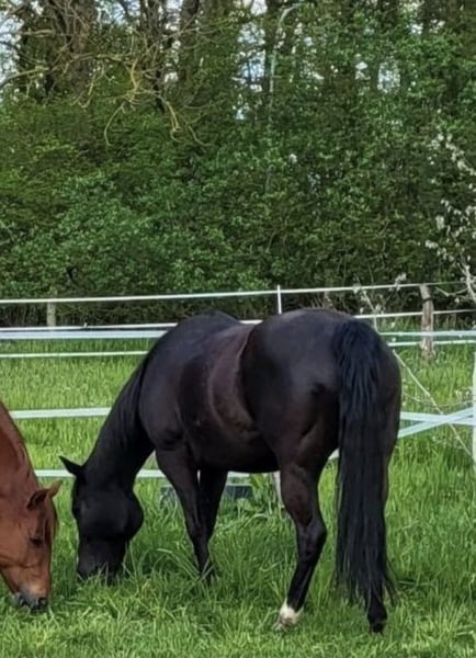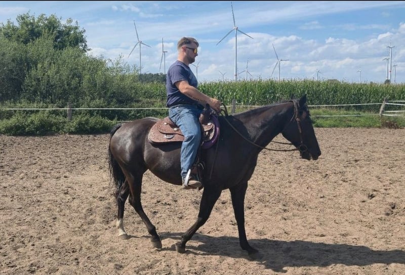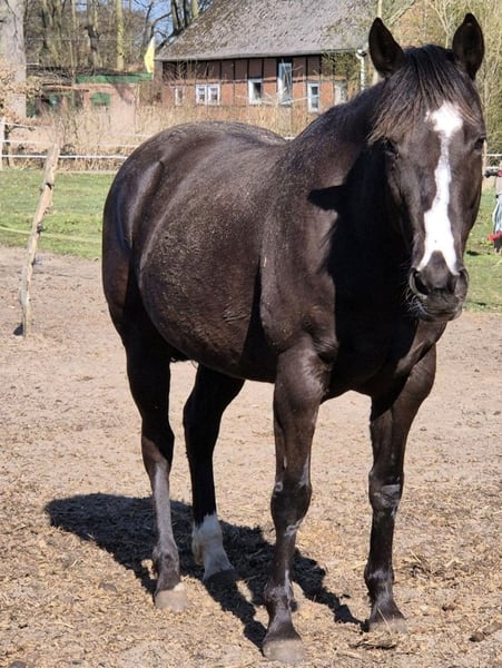 DEK Solanos Vally – menschenbezogene Quarter Horse Stute sucht passenden Menschen Zum Verkauf steht unsere Quarter Horse Stute „DEK Solanos Vally“, geboren am 27.05.2013. Diese schwarze Stute mit einer weißen Laterne, fällt nicht nur optisch auf, sondern vor allem durch ihr besonders menschenbezogenes Wesen. Ursprünglich wurde Vally bei uns für die Zucht eingeplant. Leider hat sich gezeigt, dass sie dafür nicht geeignet ist, weshalb wir sie seit Herbst letzten Jahres wieder antrainieren und arbeiten. Dabei zeigt sie sich sehr lernwillig, aufmerksam und arbeitsfreudig. Vally kennt Sattel und Reiter in allen drei Gangarten. Sie braucht einen ruhigen und souveränen Reiter, der ihr Sicherheit geben kann, wenn sie es benötigt. Im Umgang ist sie ein absoluter Schatz: Sie ist sehr menschenbezogen, verschmust und genießt jede Aufmerksamkeit. Putzen, kraulen und betüttelt werden gehören zu ihren Lieblingsbeschäftigungen. Auch Kinder mag sie sehr gerne und zeigt sich ihnen gegenüber freundlich und interessiert. Sie kennt außerdem Bodenarbeit und alleine spazieren gehen, ebenso wie regelmäßiger Umgang und Training. Ebenso muss man zu Vally erzählen dass sie sehr liebevoll mit unseren Jährlingen umgeht und diese auch erzieht. Vally ist eine sensible, kluge Stute, die eine enge Bindung zu ihrem Menschen aufbauen möchte. In den richtigen Händen kann sie ein wunderbarer Freizeitpartner werden. Vally hat ein Stockmaß von 1,50 m. Wir wünschen uns für sie ein liebevolles Zuhause mit Erfahrung und Geduld, in dem sie weiter gefördert wird und ihre Qualitäten zeigen kann. Bei ernsthaftem Interesse freuen wir uns über eine Nachricht für weitere Informationen und ein persönliches Kennenlernen.