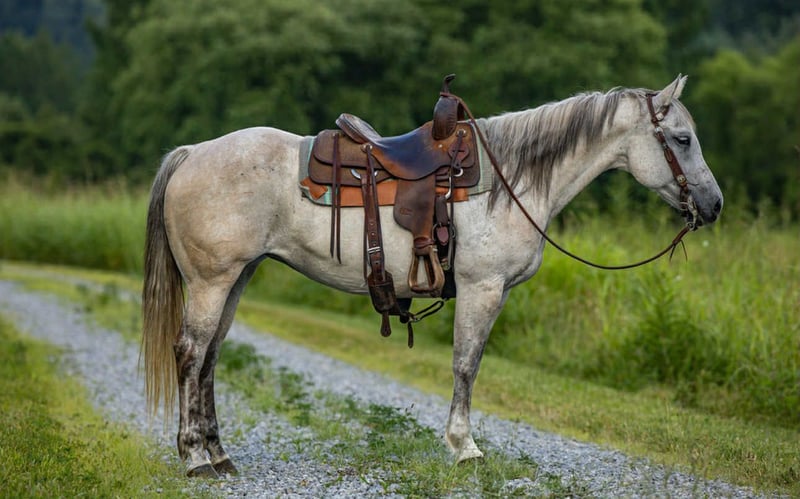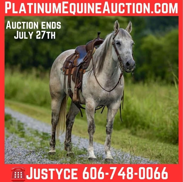 ONLINE AUCTION Place your bids at www.PlatinumEquineAuction.com Starting Bid $3500 Auction ends July 27th 2025 Need a new saddle? Check out White Rock Saddles on our website or Facebook Teacup is a 13yo grade gray mare that stands 14.2 hands. When I think of teacup 3 words pop into my mind, honest, reliable, and trustworthy. Teacup is the kind of horse you want to ride, whether it be 100° or -8° it doesn’t bug you to saddle and ride, because she’s just that good ! Teacup is not your typical mare, quite honestly I believe she identifies as a gelding, she is happy to see you, happy to be with other horses, and just happy all the time ! Teacup stands to be saddled, bridled, tacked, she loads with ease and is good in a stall or turned out. Teacup stays broke with time off and saddles up gentle no matter the weather, or time she’s been standing. Are you wanting a pint sized horse that’s stout enough to carry just about anyone ? Something easy to get on and off of on the trails ? Then teacup is your gal, although she is small, she’s mighty and can keep up with the big horses or can slow it down and drop your reins and she will ride like a snail. In the arena teacup will walk trot lope circles, she pivots and is soft in her face and sides, she has a nice light neckrein and moves off your legs as well. We’ve used teacup a lot outdoors, we check momma cows on her daily, we use her to pen back at the stockyards, and she’s my go to horse to pony colts off of, she’s zero drama and no fuss. Teacup has seen lots of outside miles and nothing phases her, she crosses anything asked, and is traffic safe as well. There’s not a hill to steep or a creek to deep for teacup. One thing I really like about teacup is you can make mistakes on her and she just takes them in a stride, halterbreaking and ponying colts isn’t always ideal, and I’ve put teacup in alot of “messes” she always picks up the slack and gets me out of trouble with ease. Not only can you make mistakes, you can ride her and never have to worry, I ride a lot of young horses and stepping on teacup is like a breath of fresh air, she’s always sane and reasonable about everything asked of her. I’ve given some lessons off of teacup and she adapts and adjust to each rider, timid? No problem! Confident? Also no big deal, teacup got ya! If you’re wanting a horse with a ton of heart, sense, and a good head on her shoulders than I suggest you consider teacup, she’s guaranteed to steal your heart in many ways! For more info contact Justyce Small 606-748-0066. Located in Wallingford, KY. ONLINE AUCTION Place your bids at www.PlatinumEquineAuction.com Starting Bid $3500 Auction ends July 27th 2025 Need a new saddle? Check out White Rock Saddles on our website or Facebook