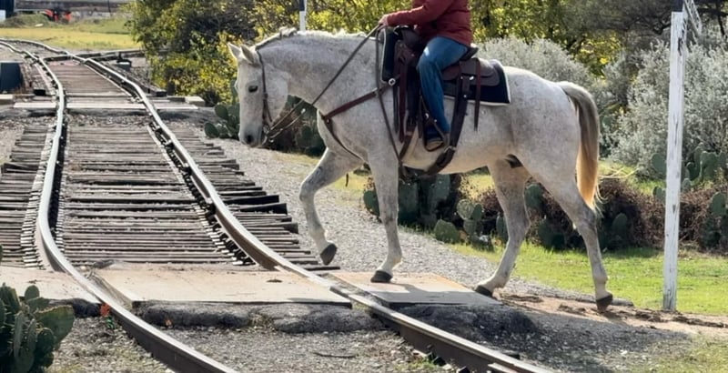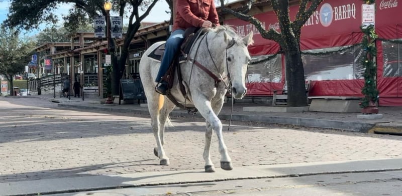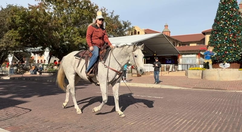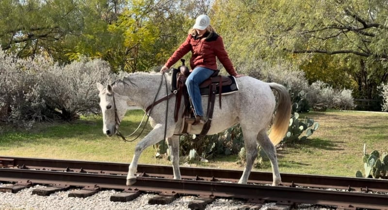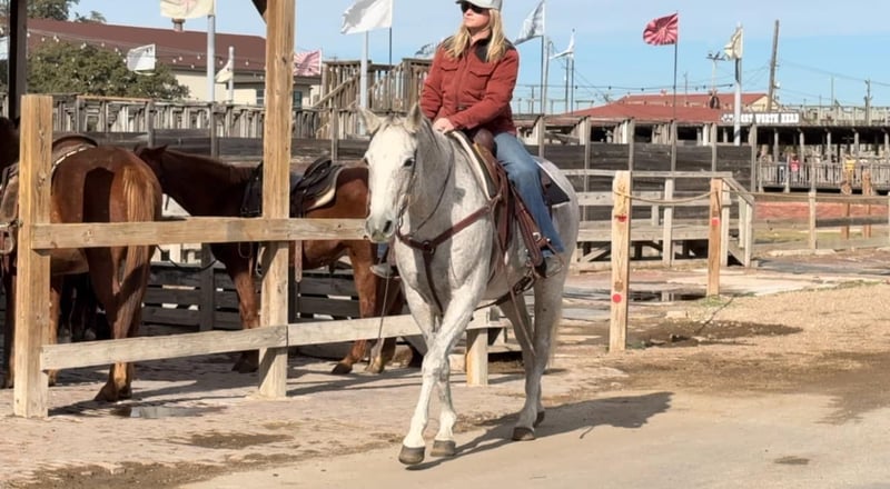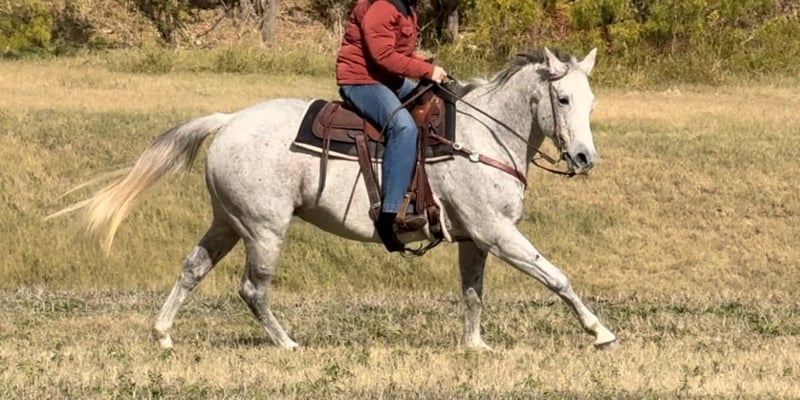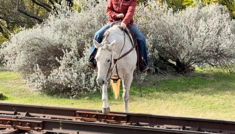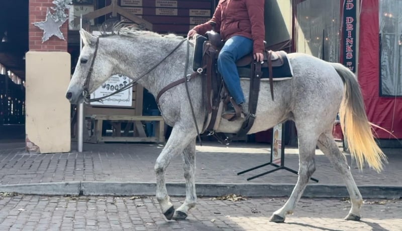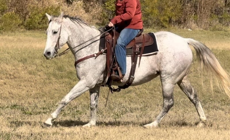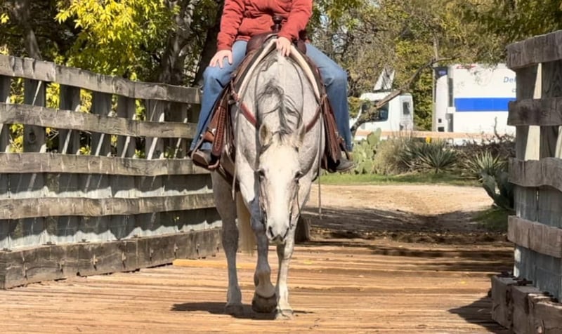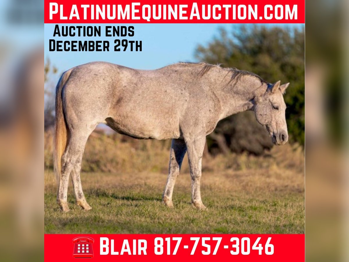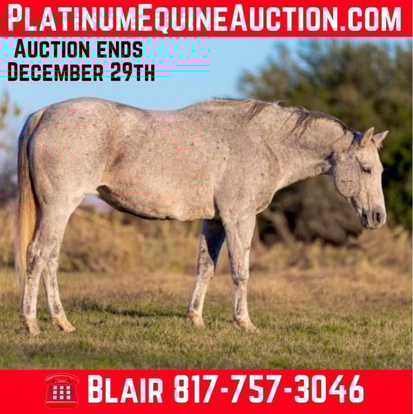 ONLINE AUCTION Place your bids at www.PlatinumEquineAuction.com Starting Bid $3500 Auction ends December 29th, 2024 Need a new saddle? Check out White Rock Saddles on our website or Facebook! Betsy or as her papers state, MS Doc Bar 2012, is a stout 15.1H 2012 model AQHA gray mare. She is as calm, cool and collected as a mare can come. Betsy does great with time off and is the same horse every ride. She was used on a ranch and raised a couple babies with them! She’s easy and gentle, if you can hold the reins, you can ride this one! She is absolutely chill everywhere you take her. Her first trip to town, she didn’t spook at a thing as you can see in the video of her at the Fort Worth Stockyards! We pulled her up weeks fresh, stepped on her on a 28 degree, windy day and she rode off PERFECTLY. Betsy neck reins with ease, moves off leg great and stops right when you tell her to! She has ZERO buck, bolt or rear and no spook! She’s done all the jobs required of a ranch horse, but she’s also quiet enough for your grandma. She would make a great horse for a trail rider looking for a safe one or the rancher looking for one he can throw his kids and wife on! She would also make a great lesson horse, beginner horse or just all around SAFE horse for anyone to take in any direction. Betsy loads, leads, bathes and ties perfectly and is easy all the way around to get along with. She is UTD on teeth, feet, coggins and is ready to go to her new home! More pics and videos on her website page at northtexashorsecompany.com/betsy. Please call Blair with North Texas Horse Company for more info at 817-757-3046. We are located in Weatherford, TX and can help arrange affordable shipping to anyone!! ONLINE AUCTION Place your bids at www.PlatinumEquineAuction.com Starting Bid $3500 Auction ends December 29th, 2024 Need a new saddle? Check out White Rock Saddles on our website or Facebook!