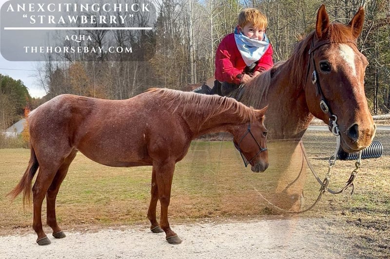 🍓 ANEXCITINGCHICK „Erdbeere“ – Groß, braver und einsatzbereit! 🍓 13 Jahre alt • 1,58 m • Stute Lernen Sie Erdbeere kennen, eine große, kräftige 13-jährige Stute mit soliden 1,58 m. Diese Stute ist braves, zuverlässiges Pferd und absolut familientauglich. Sie wurde umfangreich auf der Ranch eingesetzt – zum Raufen, Tierarztarbeiten und bei echten Ranchaufgaben. Wenn man es einfangen kann, ist sie stark genug, um es zu halten. Erdbeere ist die Art Pferd, die den ganzen Tag und die ganze Nacht unterwegs sein kann, mit der passenden Größe, Knochenstärke und mentaler Stärke. Sie hat eine gute Hand, macht Spaß beim Reiten und ist die Art Stute, mit der jeder in der Familie gut zurechtkommt. Ob Sie einen soliden Ranchpartner, ein zuverlässiges Trail-Pferd oder einfach eine große, braves Pferd mit Erfahrung und Verstand suchen – Erdbeere erfüllt alle Anforderungen.