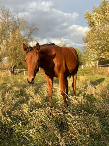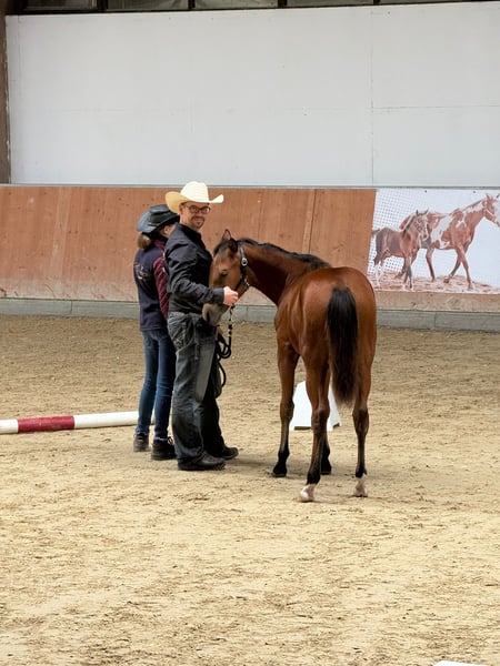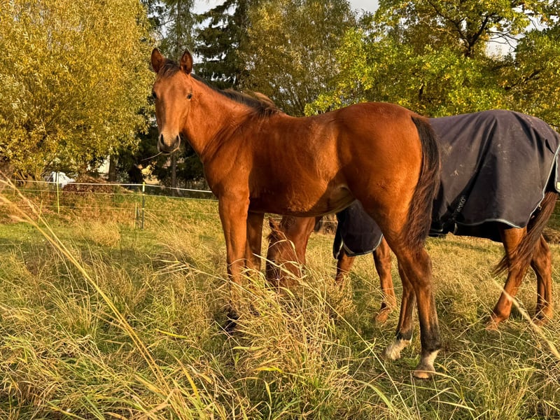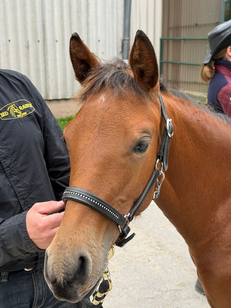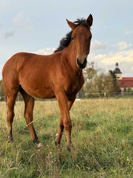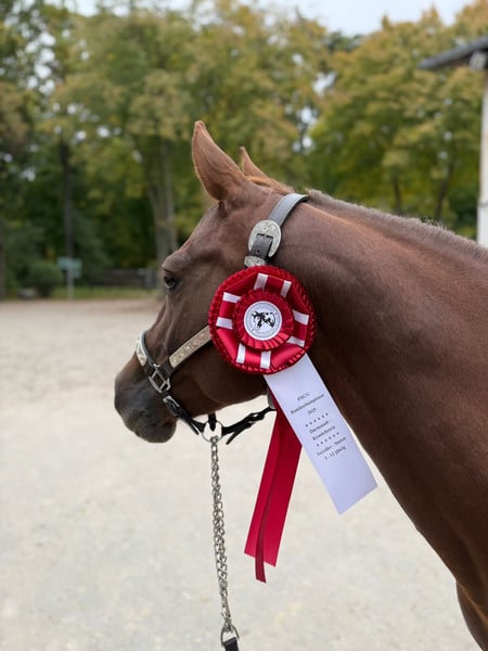 MD Pretty Miss Dunit - eine bildhübsche Quarter Horse/Paint Horse Stute, geboren am 11. März 2025. Sie präsentiert sich in der eleganten Farbe bay (braun) und wird voraussichtlich ein Endmaß von etwa 150 cm erreichen. Margie ist doppelt registriert bei der AQHA und der APHA, ihre Papiere liegen bereits vor. Bei der APHA-Fohlenschau in Könnern wurde sie mit der hervorragenden Wertnote 8,10 als 1a Prämienfohlen ausgezeichnet und belegte in ihrer Klasse den zweiten Platz. Unter insgesamt 18 Fohlen wurde sie zudem als zweitbestes Fohlen der gesamten Schau bewertet - ein Beweis für ihre hohe Qualität und ihr großes Potenzial. Diese junge Stute überzeugt durch ein sehr korrektes Gebäude, eine harmonische Bemuskelung und eine ausgezeichnete Entwicklung. Sie ist rundum gesund, wurde regelmäßig entwurmt, altersentsprechend geimpft und kennt sowohl Tierarzt als auch Hufschmied. Genetisch ist sie bestens abgesichert - sie ist 7-Panel n/n sowie LWO und Splashed White n/n getestet. Besonders auffällig sind ihre partiell blauen Augen, die ihr ein außergewöhnlich schönes und ausdrucksstarkes Erscheinungsbild verleihen. Margie wächst artgerecht im Herdenverband auf und genießt ganztägigen Weidegang. Sie erhält hochwertiges Futter, das optimal auf die Entwicklung von Sehnen, Gelenken und Knochen abgestimmt ist. Im täglichen Umgang zeigt sie sich freundlich, brav und ruhig. Sie ist aufmerksam, menschenbezogen und lernt sehr schnell. Das kleine Fohlen-ABC beherrscht sie bereits sicher, sie ist halfterführig und kennt die grundlegenden Routinen. Auch ihre Abstammung lässt keine Wünsche offen: Margie stammt aus einer erstklassigen Reining-Linie und ist DQHA-Futurity startberechtigt. Sie hat Colonels Smoking Gun/Remenic N Dunit /Arc Sparkle Surprise noch im Papier. Ihre athletischen Grundgangarten und ihre Leistungsbereitschaft lassen schon jetzt erkennen, dass sie sowohl für den Sport als auch für den ambitionierten Freizeitreiter hervorragend geeignet ist. Ob als zukünftiges Showpferd oder als treue Freizeitpartnerin - MD Pretty Miss Dunit vereint ein korrektes Exterieur, sportliches Potenzial und einen Charakter aus Gold. Für diese außergewöhnliche junge Dame wird ein liebevolles 5-Sterne-Zuhause gesucht, gerne mit der Möglichkeit, ihr Talent im Sport weiter zu fördern. Sie ist ab sofort bereit, in ihr neues Zuhause umzuziehen und ihren weiteren Weg mit Menschen zu gehen, die ihre Qualität zu schätzen wissen. NRHA Germany, PHCG Futurity und ins EWU Jungpferdeprogramm einbezahlt.
