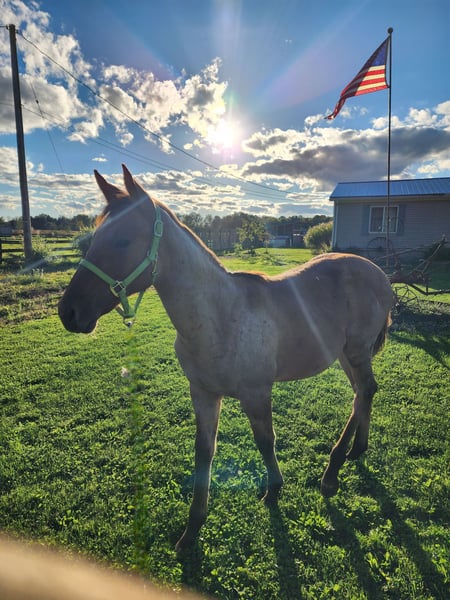 **For Sale: Exceptional American Quarter Horse Filly** Introducing a stunning American Quarter Horse filly, born in 2025, with a striking dun coat that truly stands out. Expected to mature at a solid 16 hands high, she is the perfect blend of beauty and athleticism. This versatile mare can be trained as a Western or English all-around horse, making her an excellent choice for various disciplines, from trail riding to ranch work. Her calm demeanor and strong work ethic make her suitable for any discipline. With her impressive lineage and natural talent, she is sure to excel in any arena. Whether you’re looking for a reliable partner for competition or a loyal companion for leisurely rides, this mare is ready to take you on your next adventure. Don’t miss the opportunity to own this remarkable horse. Contact me for more information and to schedule a visit!